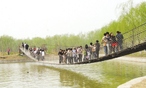 “五一”假期,记者来到杨柳青庄园,停车场里有很多旅游大巴车,也有自驾游的小车,这里到处欢声笑语,这边游客们围坐在一起感受着天然氧吧的清新,那边丛林中队员们的CS大战激战正酣……沉浸在各种活动项目中的游客将杨柳青庄园点染得绚丽多姿。来自市区的游客张阿姨说:“以前真不知道在距离市区不到半小时车程的地方,竟然还有这样一个休闲度假的好去处。这里的景色看着就让人心里舒服,如今,能够呼吸到清新空气的地方真的不多了,在离城市这么近的地方就能够看到乡村风光、享受安静的田园生活,还有这么多有趣的活动,以后我们可以经常和朋友到这里来。听庄园的工作人员说,这里的水系来源于子牙河,附近是大柳滩生态园,是真正的原生态。”
