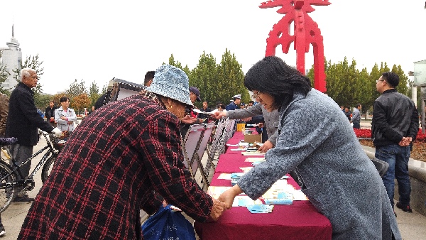 现场工作人员帮助群众答疑解惑,并发放消防安全宣传单。(11月6日摄 记者刘惟真)