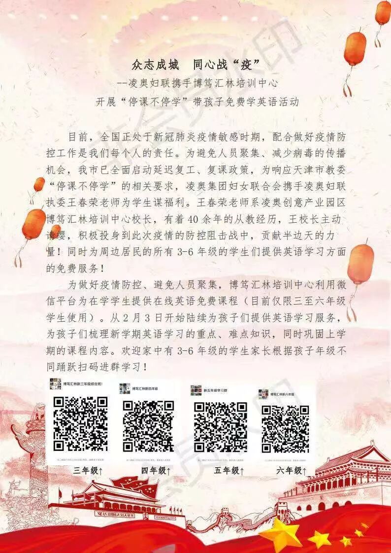 各级妇联执委身先士卒,凌奥集团妇联携手凌奥集团妇联执委、巾帼志愿者、博笃汇林的王春荣老师,为孩子们在家学习助力,利用微信公众平台免费开设三至六年级英语课程,为孩子们梳理新学期英语学习的重点难点,同时巩固上学期的课程内容,做到“停课不停学”。