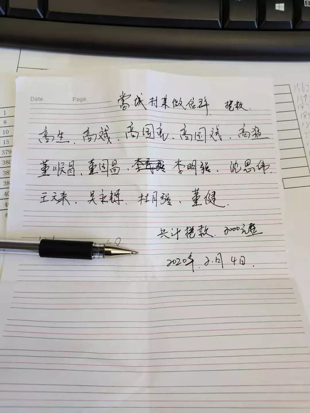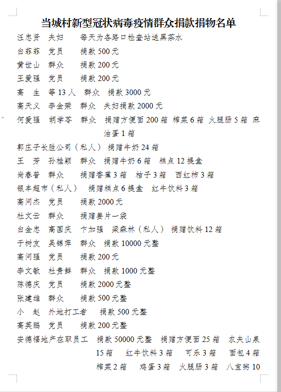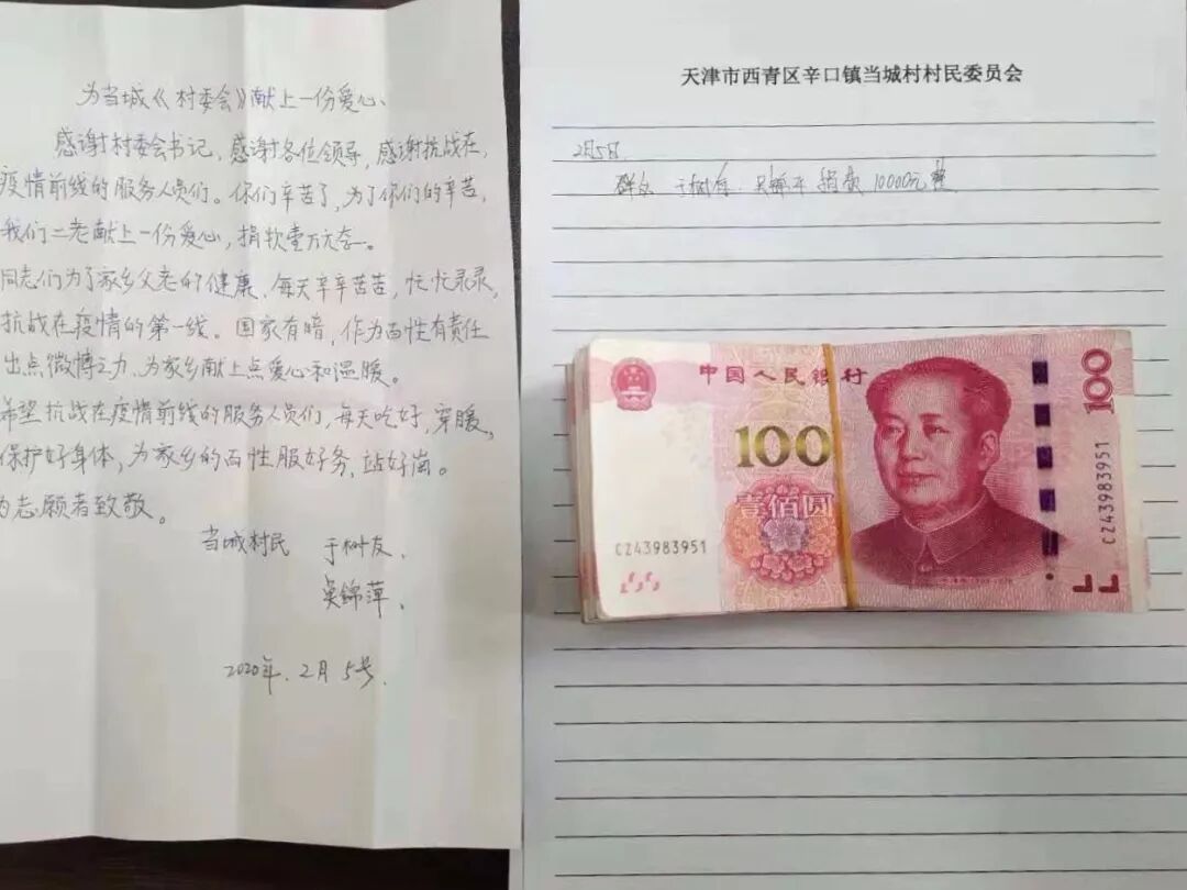 村民们也看到在村里抗击疫情第一线的志愿者们在寒风大雪中日夜执勤保护着大家,非常感动,纷纷自发自主地为村里的防疫工作捐款捐物。汪忠贤夫妇每天为各路口检查站送茶水;王田军请求多次上岗,第一天上岗就发现志愿者冷,就捐赠了20件大衣等。2月5日上午,73岁的于树友吴锦萍夫妇从南开区骑电动车在寒风中2小时来村委会捐款1万元,他们说:“感谢志愿者为当城村做的贡献,我们无以报答,捐点钱给志愿者们买点吃的用的。”2月6日上午,当城村个体户兰泰拿着10000元善款和物资送到了村委会,说,“我也要给当城村防疫工作做点贡献。”安德福地产公司3个职工代表捐款5万元并带来一封感谢信说“感谢大家对村里所作的贡献,感谢一线人员放弃小家,成全大家。”说着放下善款就去各个卡口送物资了……