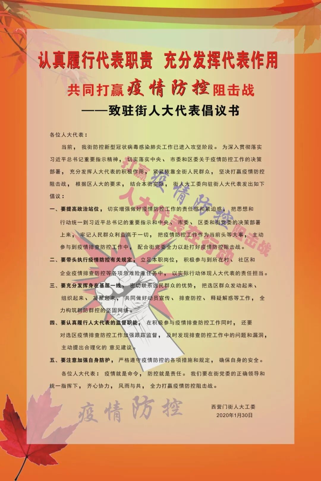 面对来势汹汹的新型冠状病毒感染的肺炎疫情,西营门街驻街区人大代表积极响应街人大工委《认真履行代表职责,充分发挥代表作用,共同打赢疫情防控阻击战》的倡议,在各自的工作岗位上主动为防控工作献计出力,认真履职尽责,主动担当作为,在街新型冠状病毒感染的肺炎防控工作指挥部的统一指挥下,充分发挥人大代表密切联系群众的优势,当好一线防控工作的指导员、宣传员、巡查员和监督员,充分彰显了人大代表的政治担当。