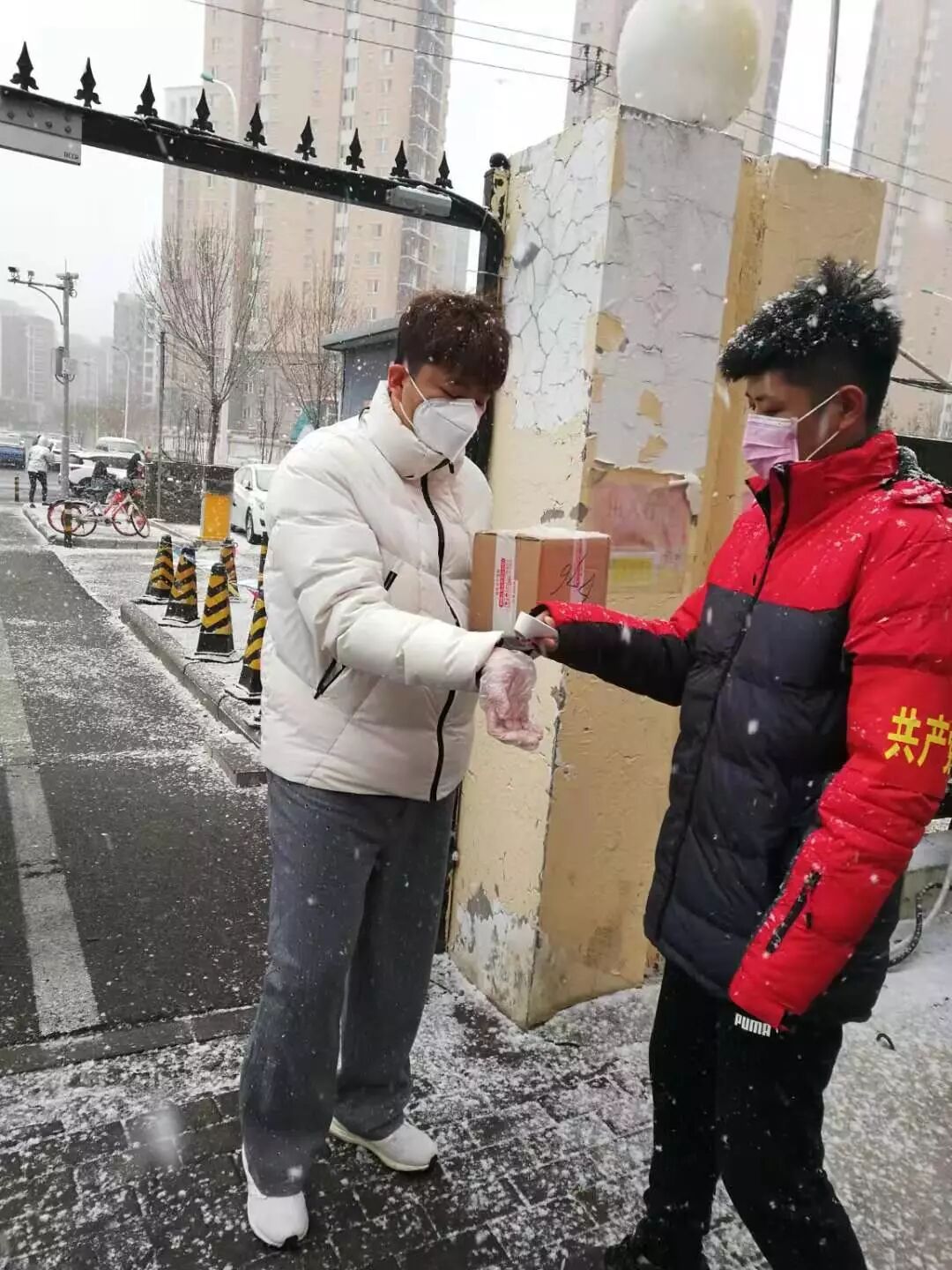 2月5日,大雪纷飞,志愿者们冒着风雪、冒着严寒,坚守着岗位,为来往的居民测量体温,防止疫情蔓延,保障居民的健康。社区居民于姨看到了志愿者们,回家后在朋友圈写下了这样一段话,一段让志愿者们红了眼圈的温暖。