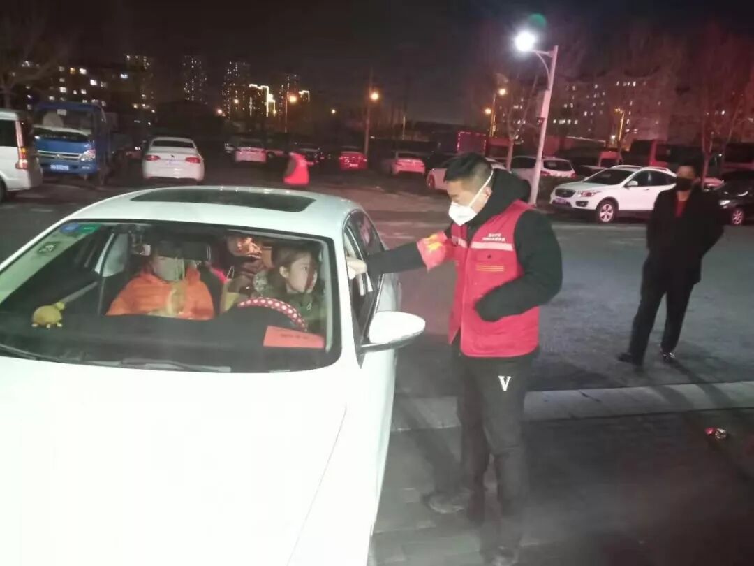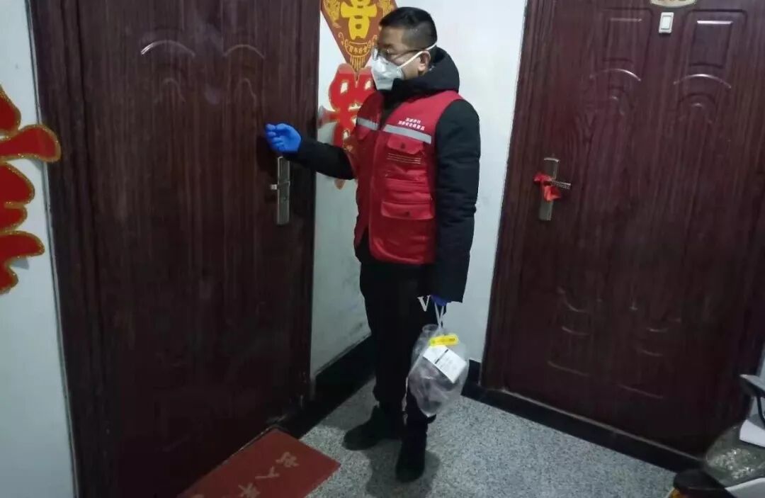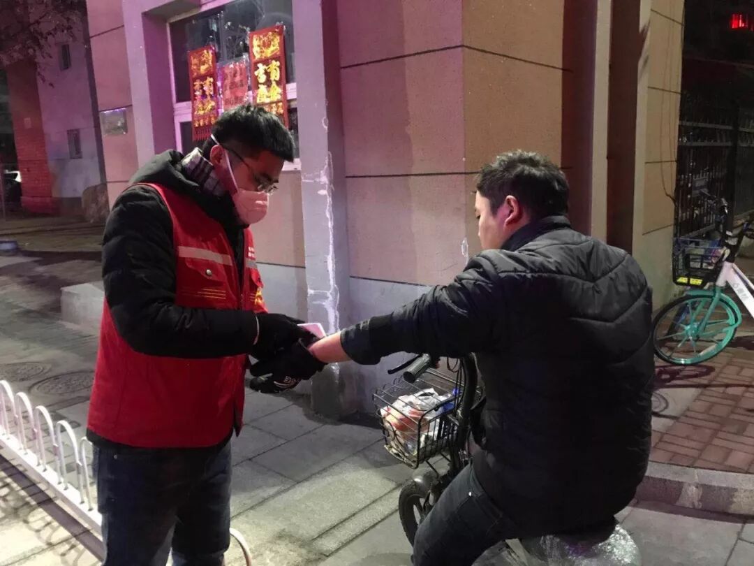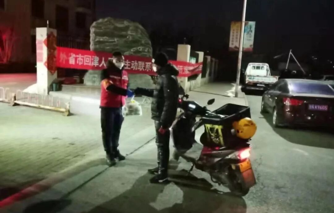 晚上8:00,街边璀璨的灯光依旧闪烁,提醒着人们年的味道。但疫情肆虐下,往常热闹的村落却人烟稀少,只剩下在逢春还寒的夜晚坚守岗位的防疫队员们的身影。此刻,马强正在充当着“外卖送餐员” 为一户正处于居家观察期的家庭送外卖。“现在特殊情况,外卖和快递配送都不能进小区,但又要保证居家观察人员的生活需求,咱们就来承担起这最后一公里的配送工作吧!”马强对记者说。之后,马强又继续回到小区入口处拿起了测温仪,从同事手里接过了夜间的值守工作。这个夜晚,马强要坚守到凌晨零点才能下班。