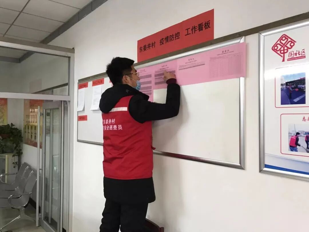 这场“防疫战”一打响,东姜井村就成立了以村党总支书记任组长的应对新型冠状病毒感染的肺炎应急小组,下设疫情巡查组、居家观察服务组,后勤保障组、话务组、宣传组,在小区电梯里增加独立播放装置,白天循环播放《致湖北武汉返津人员的一封信》《致西青区广大群众》《西青区关于严格禁止搭棚办事的通知》宣传音频,让居民多方位接收到宣传。同时,要求疫情期间村两委班子成员24小时在岗,党员要在防疫期间亮出身份,充分发挥先锋模范作用。