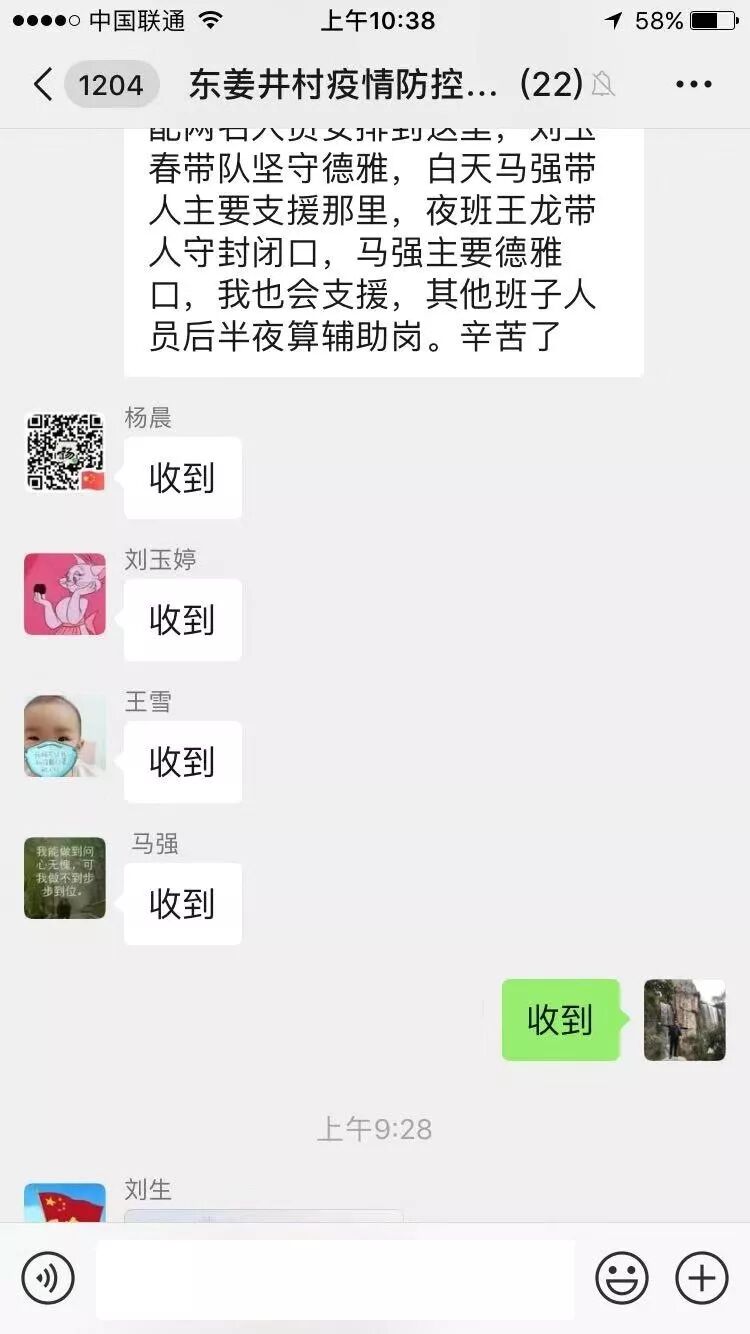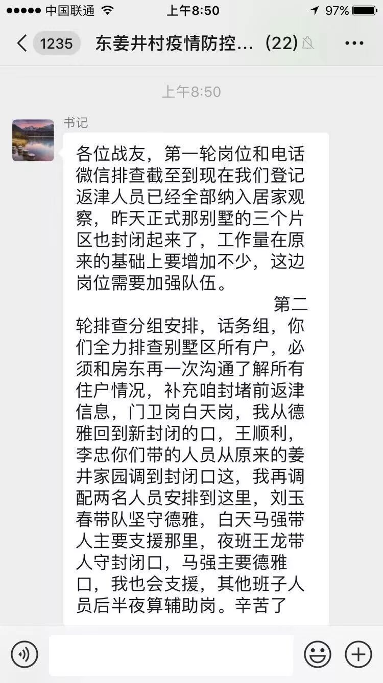 上午8:00,在工作人员的带领下,记者来到了东姜井村一处居民小区门口的检测点,找到了村党总支书记宋佩明,他是今天这个检测点的第一批轮班人员。站岗的同时,他还在微信工作群里跟大家梳理这几天的工作,查找漏洞,商量面临新问题的解决办法“第一轮排查肯定不够,还需要第二轮排查......”。了解到记者的来意,宋书记说:“这个时间大家都在各自岗位上忙活着,只能通过微信布置工作了。村防疫工作开展至今,大家都非常辛苦!但目前正处于外来人员返城高峰,丝毫也不能松懈。经过努力我们基本都完成了对居住片区的第一轮排查,但这肯定不够,还需要第二轮排查,一来是进一步核准信息,二来是重点针对还没有返津的人员。要一个个打电话给这些人,询问他们何时回、怎么回以及身体状况等,回来以后我们还需要采取必要的隔离措施。”