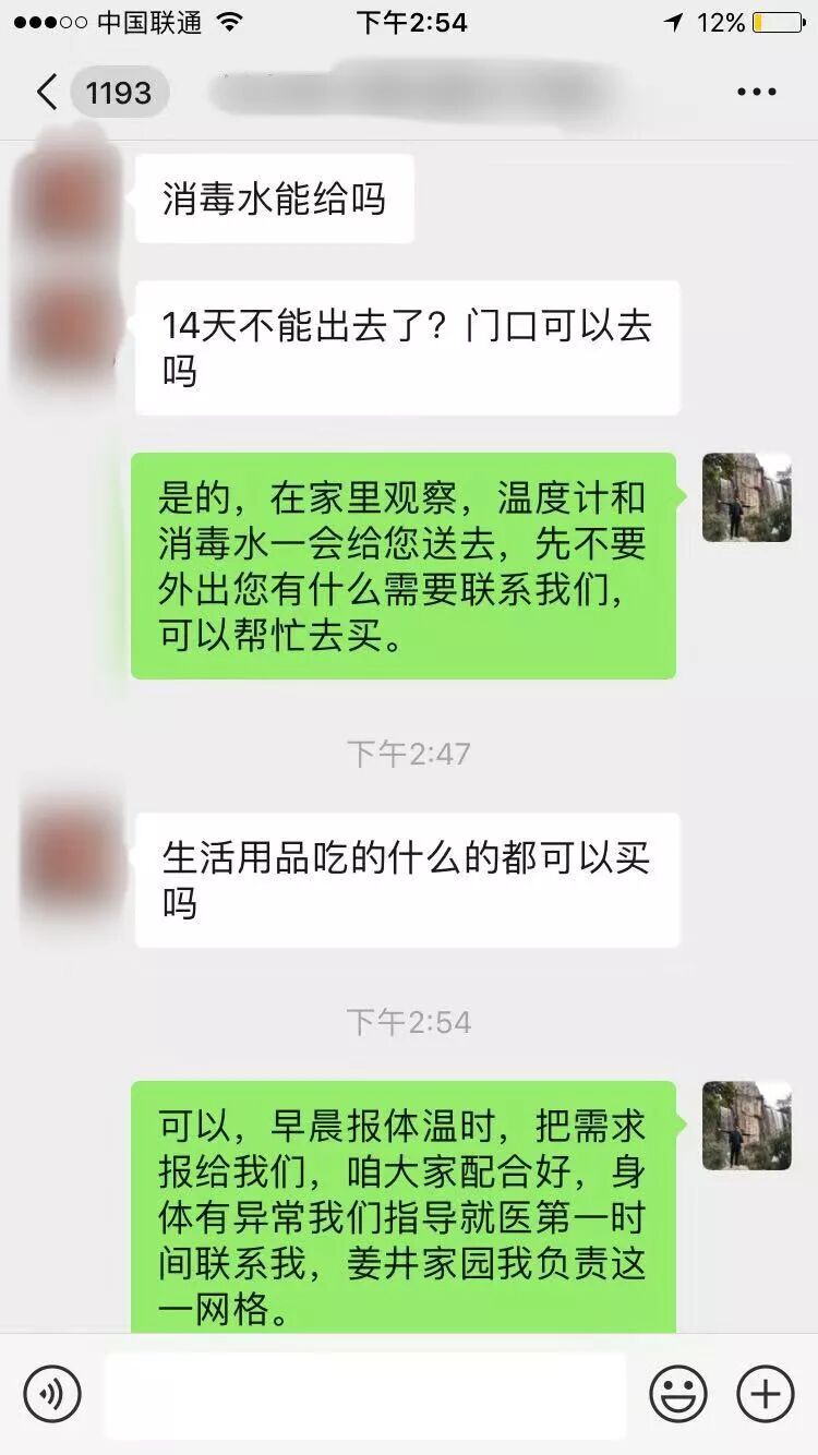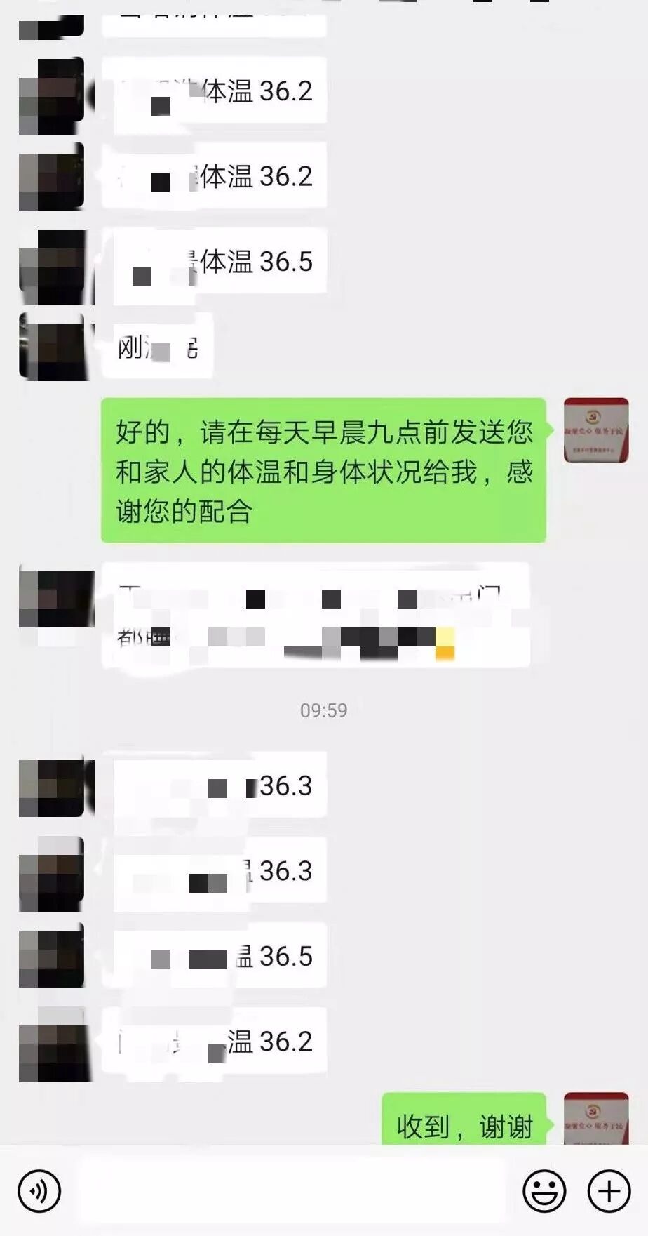 目前东姜井村有居家观察人员46户,王龙和另一位同事每人负责23户。他每天通过微信和这些家庭保持着密切联系,一天两次记录每户每个人的体温变化情况、接收他们生活必需品的采买信息。“大多数居民还是非常理解和支持我们工作的,每天都会主动上传体温。为了减轻我们的工作压力,很多居民在生活用品需求上都是能坚持就坚持,轻易不给我们添麻烦”,王龙对记者说。