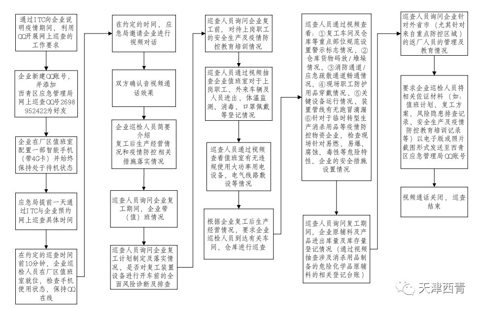 网上巡查实行提前预约制,即巡查前一天与企业预约当天巡查的时间。巡查工作重点涵盖:一是复产复工企业安全生产和疫情防控主体责任落实情况,包括:①复工前是否召开厂领导班子安全生产专题会议、②是否开展了岗前安全教育培训、③是否组织了综合性的生产安全检查、④是否制定了复工期间的应急处置方案、⑤是否对复工人员进行百分百的疫情防控宣传教育、⑥是否对外地返津人员实施百分百登记并采取隔离措施、厂区、⑦职工是否采取百分百的消毒及个体防护等措施;二是每日应急值守工作安排情况;