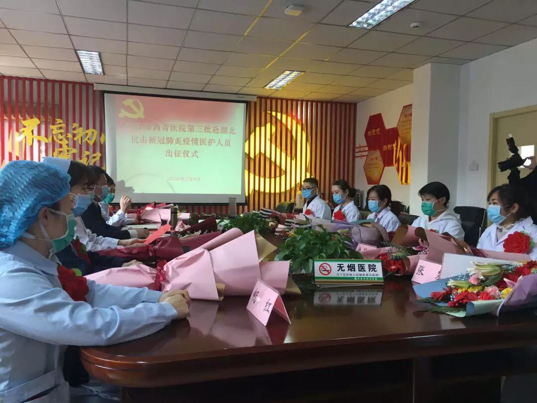 2月9日15:00,第三批援鄂医疗队伍出征仪式在西青医院行政二楼会议室举行。“当下湖北人民最需要的是全国人民的支持”,闫丽娜说道,“作为一名党员,作为一名医务工作者,有责任与武汉人民站在一起,共渡难关。”她代表全队人员表示,将牢记使命,不负重托,积极投身疫情的防控和救治工作当中,充分展现该院医疗人员的精神风貌和责任担当。