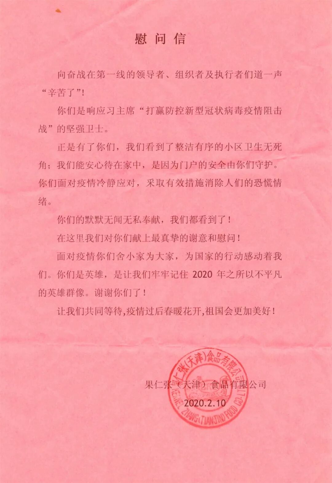 ![]() 为了助力全区“新冠”肺炎防疫抗疫工作,切实发挥传统老字号民营企业社会责任担当,果仁张(天津)食品有限公司向西青区防疫抗疫一线捐赠传统特色产品100箱,总价值4万余元,并通过一封真诚的“慰问信”向全区奋战在抗疫一线的工作人员致以真挚的问候。 ![]() 果仁张(天津)食品有限公司总经理张有表示,防疫抗疫一线人员是响应习近平总书记“打赢防控新型冠状病毒疫情阻击战”号召的坚强卫士,是我们新时代的英雄,让我们共同努力,等待疫情过后春暖花开,祖国会更加美好!” ![]() |