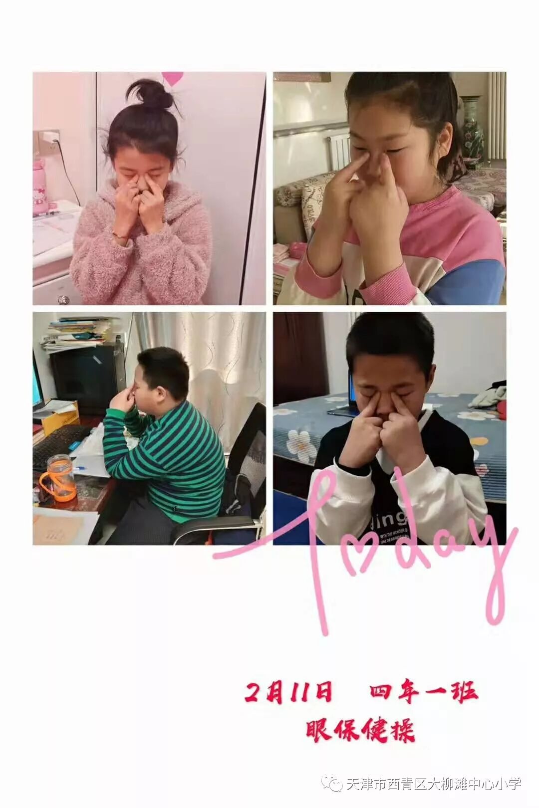 在举国上下抗击疫情的特殊时期,我们迎来了2020年度春季开学,同学们经过两天的学习生活,是不是已经逐渐适应了网上学习方式与节奏,你们的表现让老师们大加赞赏,同学们都学到了许多知识,掌握了不少新的本领。 ![]() ![]() ![]() ![]() ![]() 那么,我们每天在网上学习,很长时间和电子产品打交道,眼睛是否会感到疲劳,老师提醒同学们一定要注意用眼卫生呀!温馨提示如下: 一.养成良好的用眼习惯 制定合理的作业计划,同时要保证正确的书写姿势。家长要提供合适的用眼光线,不能在太强或太弱的光线下用眼。 ![]() 二.督促做好眼保健操 利用每天上下午的眼睛保健操来缓解眼疲劳,望家长能督促孩子认真做好眼保健操。 ![]() 三.巧用护眼小妙招 特殊时期,我们推荐一些保护视力、防控近视的妙招。 1.这是浙江大学医学院附属第二医院眼科中心团队制作的特殊时期护眼视频,各位家长可以带自家孩子锻炼起来哦。 遵循“20-20-20”口诀: 阅读、书写、看手机及电脑等20分钟后, 要抬头眺望20英尺(6米外) 远方至少20秒以上放松下。 2.现在很难做户外活动,建议经常去阳台、窗边等有自然光的地方,尽量在自然光下书写、阅读、休息,并尽可能多眺望远方。在疫情的防控上,房间要多通风,大家可以在通风时和自然光亲密接触一下。另外,要保证每天睡眠10小时,并多做一些室内的活动。睡眠、室内活动的时间多了,近距离用眼的时间自然就少了。 ![]() 四.均衡营养防疲劳 要注意均衡饮食,多吃水果蔬菜,少食甜食。保证营养全面。家长要严格把控孩子玩手机、看电视的时间。 通常寒假是儿童青少年眼科就诊高峰,但在特殊疫情时期,提醒家长们尽量少带孩子们来眼科,这些检查请大家暂缓就诊,包括:儿童青少年视力筛查及复查;近视、远视、散光等相关验光配镜;角膜塑形镜验配及复查;斜弱视检查等。但如果有突发眼红痛伴头痛;突发视物模糊、视野缺损、暗影固定遮挡;眼部外伤后伴视物模糊眼痛等情况,一定要在做好防护前提下及时就诊! 最后,再推荐一套由我国飞行员视力标准的制定者研究推出的有助于恢复视力的“米字操”。(适用于近视500度以下的患者) 同学们,疫情当前,防疫知识要掌握,正确用眼也不能忘。在保证良好视力的前提下,我们一起做好线上学习任务。一定坚持良好的用眼习惯和健康的生活方式,呵护好自己的眼睛,让我们一起去迎接光明美好的未来! |