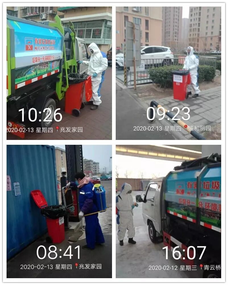 口罩,是预防“新冠”肺炎传播的利器,但是口罩使用的时限性决定了后续将产生大量的“废弃口罩垃圾”,为防止出现二次污染,西营门街以最快地速度购置了一批有害垃圾桶作为废弃口罩专用投放桶,并张贴了投放明白纸,在各村(居)、机关所属单位、小学、市场、地铁站口等醒目位置摆放。每日安排专人专车在做好自身防护的前提下对废弃口罩专用投放桶进行消毒、清运并进行无害化处理。街域内居家观察人员的生活垃圾也安排由专人专车清运,保证随产随清,做到及时消毒,杜绝二次污染。在疫情面前,他们毫无畏惧,没有丝毫怠慢。
