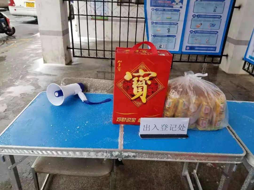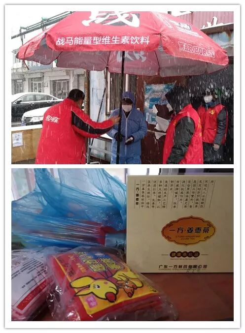 雨雪天社区居民为利海家园社区值守干部送来大型雨伞和红糖、暖宝宝等御寒防护品