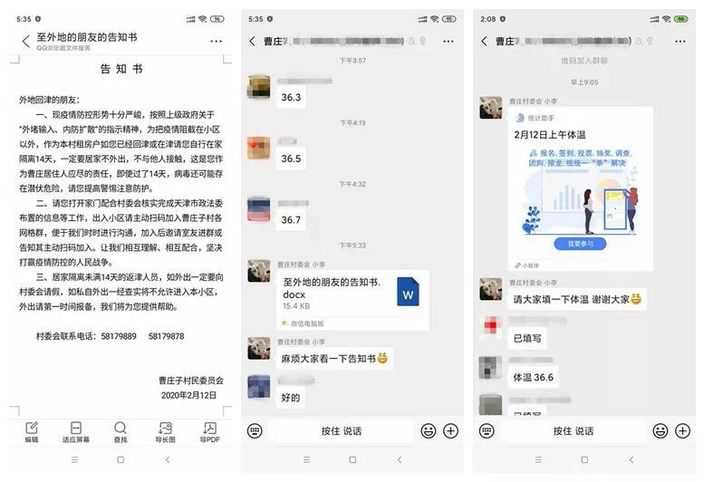 因为工作原因来到中北镇的李女士,暂时租住在曹庄欣苑社区,单位还未开工,她也是在家办公,前几天在社区门口扫码加入了曹庄欣苑社区的外来人员网格群,群里要求每天上报两次体温,她说:“曹庄欣苑紧邻曹庄地铁站,是外来人口、租房人员比较多的小区,社区的这种方式能尽可能的把握所有外来人员的情况,自己住着也比较放心。”