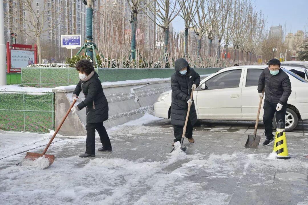 广大机关干部一上班便拿起铁锹、扫把,对工作区域及中北大道、物美超市、汪庄子商业街周边人行道路进行清雪。镇巡控队员对镇综合便民服务大楼周边进行清雪,确保居民出行办理事务有一个良好的环境,并派专人在楼两边做好车辆停放引导工作。各社区也在有序组织清雪行动,保障居民出行安全。