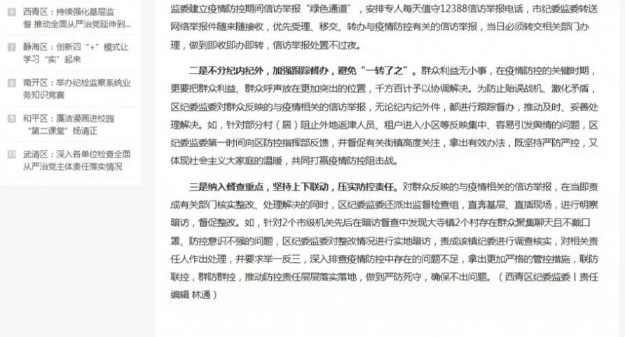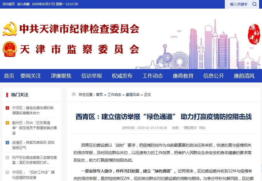 西青区纪委监委以“战时”要求,把疫情防控作为当前最重要的政治任务来抓,快速处置与疫情相关的信访举报,及时回应群众关切,以迅速有力的工作效果,把维护人民群众生命安全和身体健康的要求落到实处,助力打赢疫情防控阻击战。