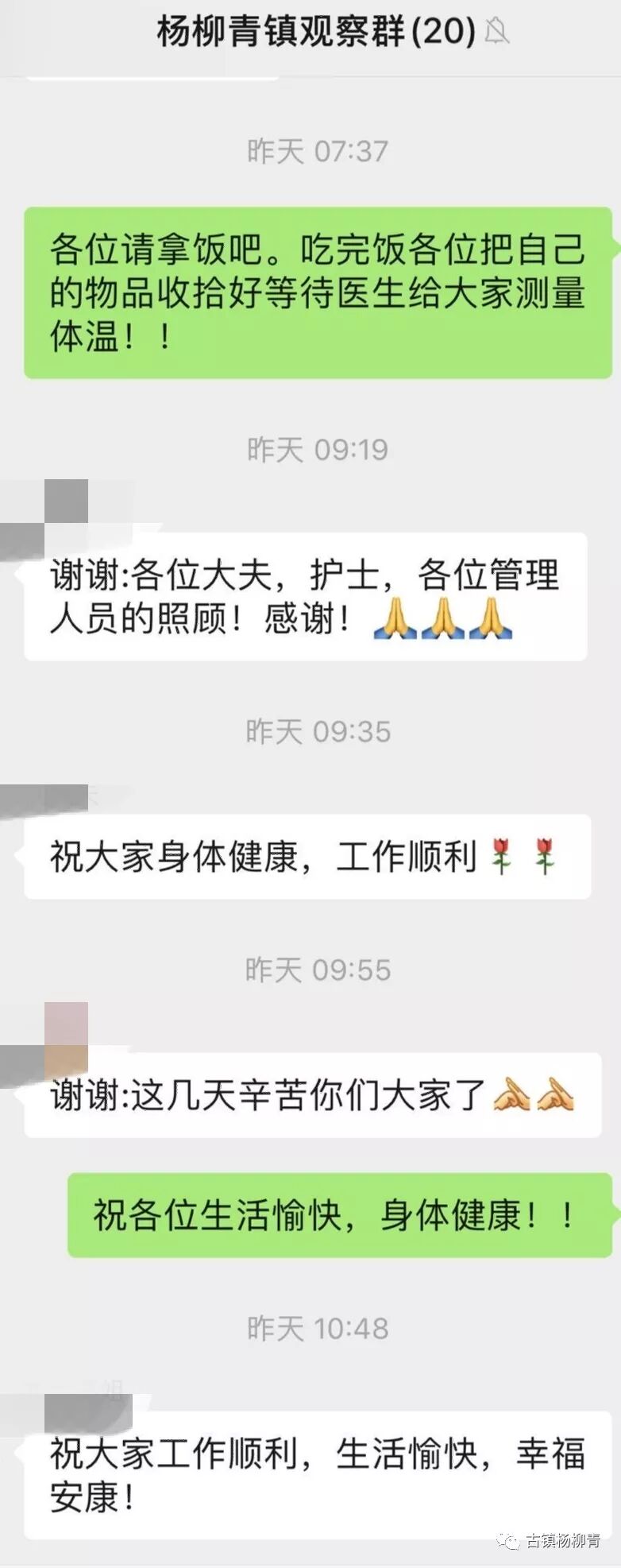 临时“隔离观察点”,隔离病毒,但绝不隔离爱。每一位入住人员住进“临时的家”后,就立刻感受到热情与温暖。“谢谢各位大夫、护士,各位管理人员的照顾!感谢!”“谢谢,这几天辛苦你们大家了!”在微信群里,我们看到了这样的留言。