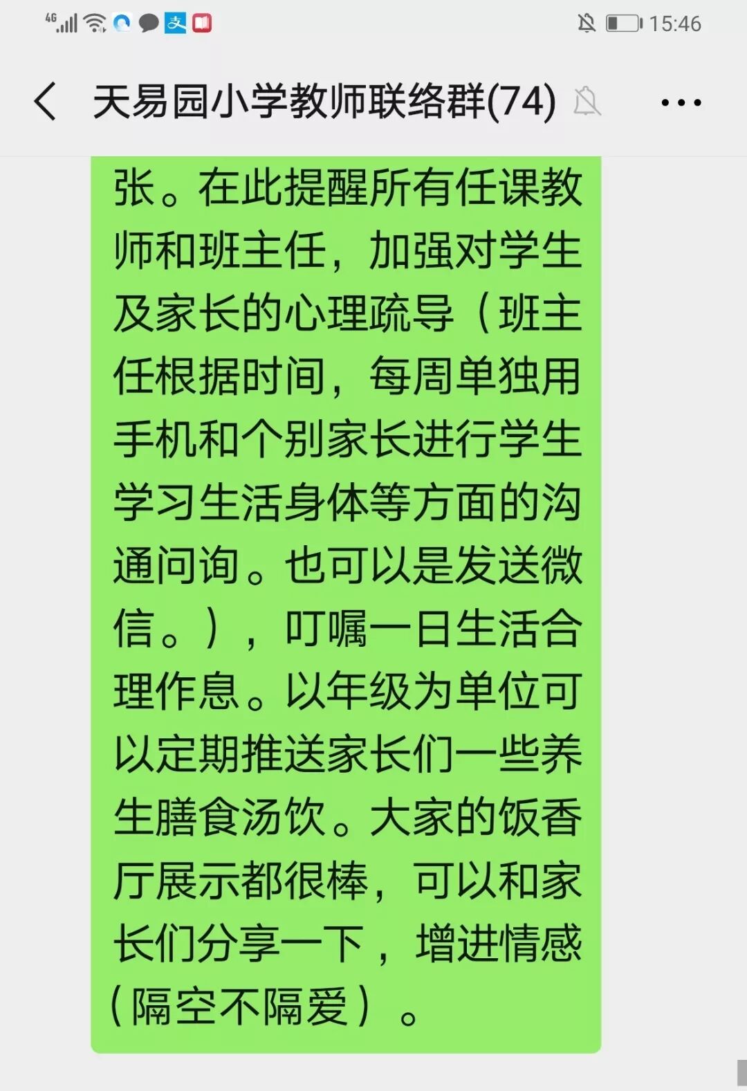 新型冠状病毒来势汹汹,打乱了我们正常的生活节奏,牵动着全国亿万人民的心。疫情就是命令,防控就是责任。为此,天易园小学依照上级精神,积极开展“停课不停学”系列活动,全体教师主动作为,各位家长积极配合,各项工作顺利推进,努力为学生营造良好的居家学习、生活氛围,努力将文明校园的创建在这一特殊时期延伸到家庭。 01.亲子活动篇 停课不停学,在这个非常时期,天易园小学的家长们,使我们的家庭课堂精彩纷呈……此次“停课不停学”活动,增进了亲子关系。家长们积极响应,享受亲子时光。 劳动美社会实践活动——家务劳动 ![]() 孩子们在劳动实践活动中,学会了与家人协作,收获了亲情。更为重要的是在实践中感受到了劳动给人带来的快乐,激发了学生们热爱劳动的情感,从而形成良好的家风。 居家体育锻炼活动 ![]() 特殊时期,亲子锻炼也成了孩子每天晚饭后及业余时间的一项必不可少的活动,也成了家长与孩子快乐运动、愉快交流的重要环节。 丰富多彩的家庭课堂 ![]() 下棋、弹琴、书法……各种家庭艺术活动,让学生们的每日居家生活变得丰富多彩。 亲子阅读书香满屋活动 ![]() 亲子共读,是一种学习手段,也是一种生活方式,通过这种方式,家长教会孩子如何热爱生活、享受生活;亲子共读,是一种美丽的休闲,孩子的成长其实也是一本书,多一点心思,多一点投入,收获的其实不仅是孩子。 家庭生活中的爱国主义教育 ![]() 疫情无情人有情,疫情居家期间正是家庭里开展爱国主义教育的很好的契机。特殊时期的“升旗仪式”、“为祖国加油”等活动,在每个学生心中种下一个“爱国种子”。 02.师生交流篇 面对疫情肆虐,做有担当的教育人。各学科组教师分别通过电话、QQ群、微信群、网络视频会议等方式进行教研,明确开学要求,精心备课,提前进入工作状态,齐心协力,确保此次在线教学高质量,高效益。老师们每天用自己最平凡也最执着的坚守,为孩子们的学习保驾护航。 ![]() 认真答疑解惑 ![]() 03.幸福分享篇 停课不停学期间,每一位老师的心中充满了激情,每一位同学、家长心中充满了对老师的信赖,留下了一个个幸福的画面。 家长 ![]() 感言 教师幸福感悟 ![]() 学生收获幸福 ![]() 比起以往书声朗朗的教室,如今冷清宁静,但老师那振奋人心的激情,透过网络浓浓地感染着同学们!网络的那一边,同学们朗朗的读书声会通过网络传到每个人的耳畔;同学们对问题精彩的分析与回答丝毫没有因为时空的隔绝而逊色半分!天易园小学校长李桂玥对全校师生的关心、关爱推进我们做到隔空不隔爱。 ![]() 幸福分享之饭香厅展示(已分享给家长) ![]() 幸福分享之重温养生粥制作 让我们同舟共济,勇担责任;并肩前行,共筑梦想! 最后,让我为一起为武汉加油!为祖国加油! |