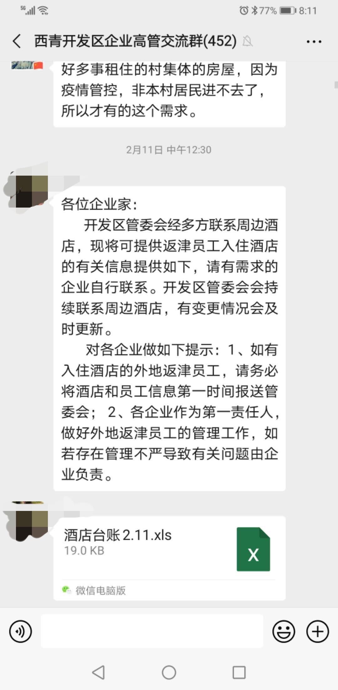 随后,西青开发区立即对名单上的20余家酒店进行了逐一对接,在确认企业营业时间后,着重了解酒店消杀工作是否到位、可提供的房间数以及能否提供三餐等问题,多角度筛选出优质酒店,贴心提出“返工套餐”这一概念,其中包含14天房间+早中晚3餐+饮用矿泉水+口罩等。在此基础上,西青开发区管委会每日更新酒店台账,将更新信息及时发送到企业高管群,以供企业选择和入住,助力开发区内企业落实员工返工前的隔离住宿需求,细心为企业复工提供全方位保障。另外,西青开发区管委会对酒店每日的消杀情况、人员管理及日常用餐进行严格要求,安排专人督促酒店旅馆疫情防控工作的落实,并每日汇总酒店房间预订情况和入住情况,为企业推送实时信息和数据。