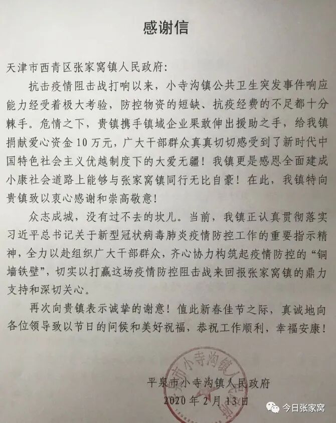 近日,张家窝镇党委、政府收到一封特殊的来信,信中写到“抗击疫情阻击战打响以来,小寺沟镇防控物资短缺、抗疫经费不足,十分棘手。危情之下,张家窝镇携手镇域企业果断伸出援助之手,为小寺沟镇捐献爱心资金10万元……在全面建成小康社会道路上能够与张家窝镇同行无比自豪! ”这是一封来自河北省平泉市小寺沟镇人民政府的感谢信,殷殷感谢之情跃然纸上,透露着张家窝镇在危急时刻鼎力相助,与当地干部群众齐心协力构筑起疫情防控的“铜墙铁壁”,这股暖流让小寺沟人民在无情的灾难面前感受到亲人般的温暖。