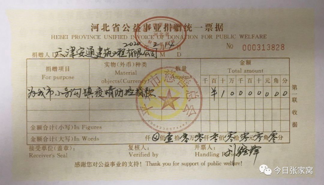 众志成城,没有过不去的坎儿。在疫情防控的特殊时期,为全面落实习近平总书记关于新型冠状病毒肺炎疫情防控工作的重要指示精神,张家窝镇还向建立对口帮扶关系的新疆于田县捐款13万元,并携手镇内爱心企业天津市誉都园林绿化工程有限公司、天津微视博特科技有限公司向甘肃省景泰县草窝滩镇捐款10万元,捐赠口罩1000个。隔空不隔爱,千里传真情,这份爱心伴随着全镇人民的支持与嘱托,最终汇成一股暖流,传递给千里之外的“亲人”,如春风化雨般,滋润他们的心田。