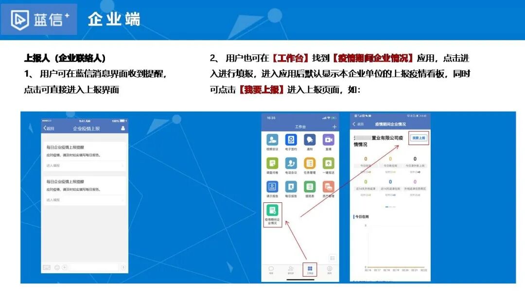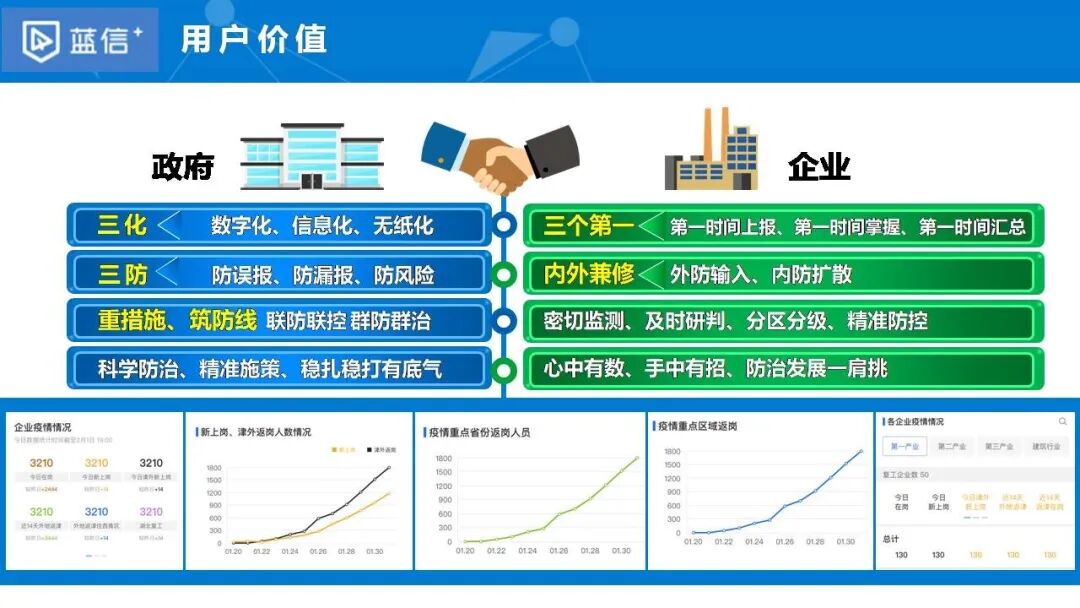 通过“疫情期间企业情况上报系统”,政府与企业基本可以实现数字化、信息化、无纸化沟通。一方面,管委会能够及时、准确、透明地掌握辖区内企业的复工情况和复工人员的健康状况,决策定位清晰合理、服务精准收效有理。另一方面,企业通过“疫情期间企业情况上报系统”数据分析和风险监测,能够监测人员回流动态、跟踪生产复工动态、掌握内部风险动态,第一时间上报、第一时间掌握、第一时间汇总,实现摸底排查有抓手、疫情管控有工具。通过方便、快捷、准确的“疫情期间企业情况上报系统”,助力企业复工,提振经济发展,政府防控施策有底气,企业规划发展有信心。众志成城,全力确保打赢疫情防控“阻击战”和复工复产“阵地战”。齐心协力,全力以赴完成“抗疫情、保增长”两大攻坚任务。