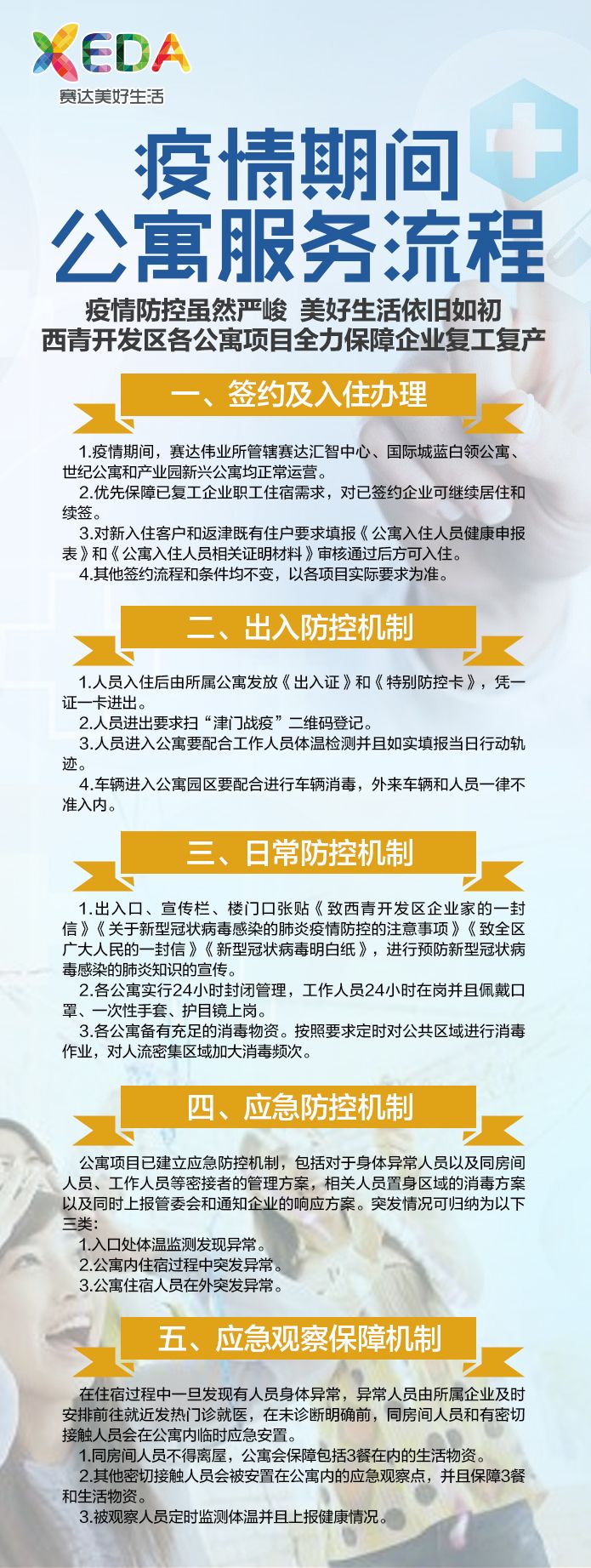 随着“复工潮”的来临,西青开发区全面推进企业复工复产工作,大批企业员工住宿问题成为当务之急。赛达伟业旗下汇智中心人才公寓、国际城蓝白蓝公寓、世纪公寓和产业园新兴公寓制定了防疫期间公寓服务流程,对返津后原住户和新签约住户要求填报《公寓入住人员健康申报表》《公寓入住人员相关证明材料》。此外为应对入口处监测异常、居住中突发异常和在外突发异常三种紧急情况,各公寓项目分别在记录出入轨迹、设立临时观察点和观察期生活保障等方面都做了充足准备和演练。入住审核“一表一证明”、出入审查“一证一卡”、能有效处置“三种突发情况”、严格落实 “四级消毒制度”…赛达人有决心有信心,必全力保障开发区企业复工复产后职工住宿需求,做到让职工放心、让企业放心、让社会放心。