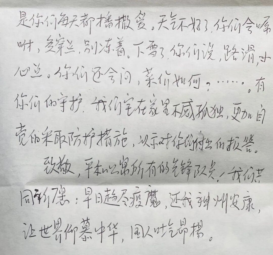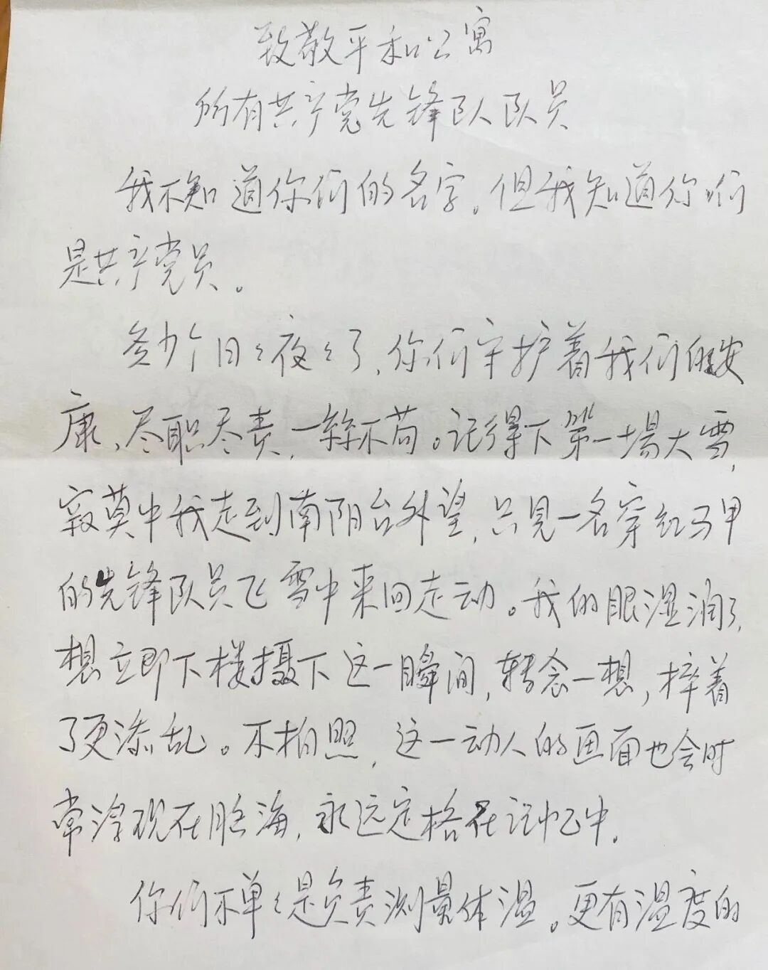 2月24日,正在平和公寓值岗的志愿者收到了一封居民的信,这是一封有温度、有意义的信件,看到内容的那一刻,志愿者们觉得再苦再累都值得! 致敬平和公寓所有共产党先锋队队员: 我不知道你们的名字,但我知道你们是共产党员。 多少个日日夜夜了,你们守护者我们的安康,尽职尽责、一丝不苟。记得下第一场大雪,寂寞中我走到南阳台外望,只见一名穿红马甲的先锋队员飞雪中来回走动。我的眼湿润了,想立即下楼摄下这一瞬间,转念一想,摔着了更添乱。不拍照,这一动人的画面也会时常浮现在脑海,永远定格在记忆中。 你们不单单是负责测量体温,更有温度的是你们每天都播撒爱。天气不好了,你们会嘱咐多穿点、别冻着;下雪了你们说路滑、小心点。你们还会问菜价如何。。。有你们的呵护,我们宅在家里不感孤独,更加自觉的采取防护措施,以示对你们付出的报答。 致敬,平和公寓所有的先锋队员!我们共同祈愿:早日趋疫魔,还我神州安康,让世界仰慕中华,国人吐气昂扬。 ![]() ![]() |