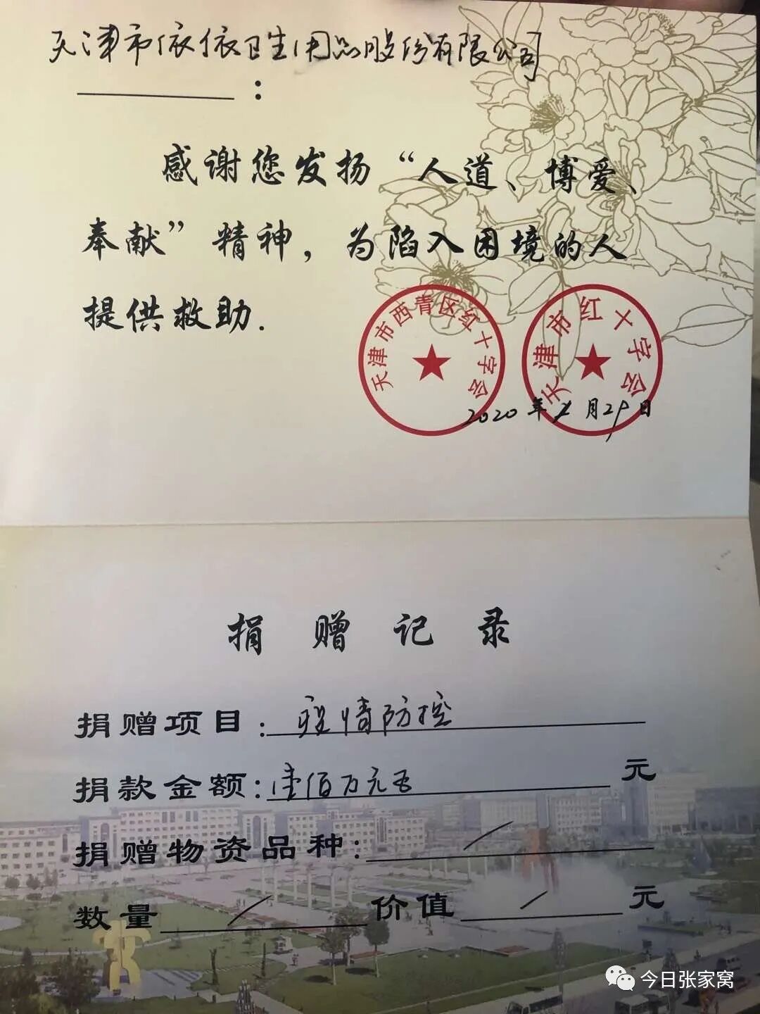 面对严峻的疫情防控形势,防护物资消耗较大,且采购困难。1月28日,区指挥部发布了《西青区接收社会捐赠公告》后,张家窝镇社会各界和爱心人士积极行动、踊跃捐款捐物,为做好疫情防控工作增添了强大动力。镇内企业顶硕科技和中升挑战生物加大马力生产消毒剂免费供应一线,际华新能源转产防护服,依依卫生用品捐款100万元、华捷电力捐款20万元、红联橡胶捐款20万元、津津药业捐款20万元……商户、市民也各显神通,通过各种途径采购口罩、酒精、消毒剂等防疫物资进行捐赠,纷纷表达心意,助力疫情防控。