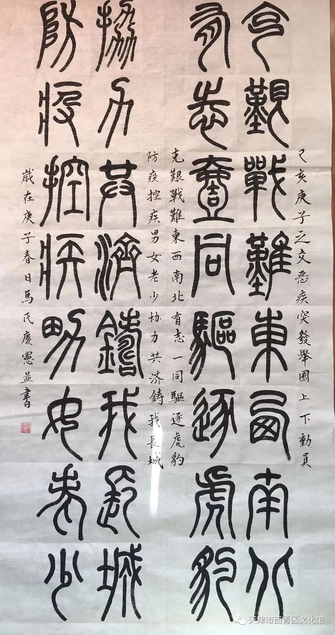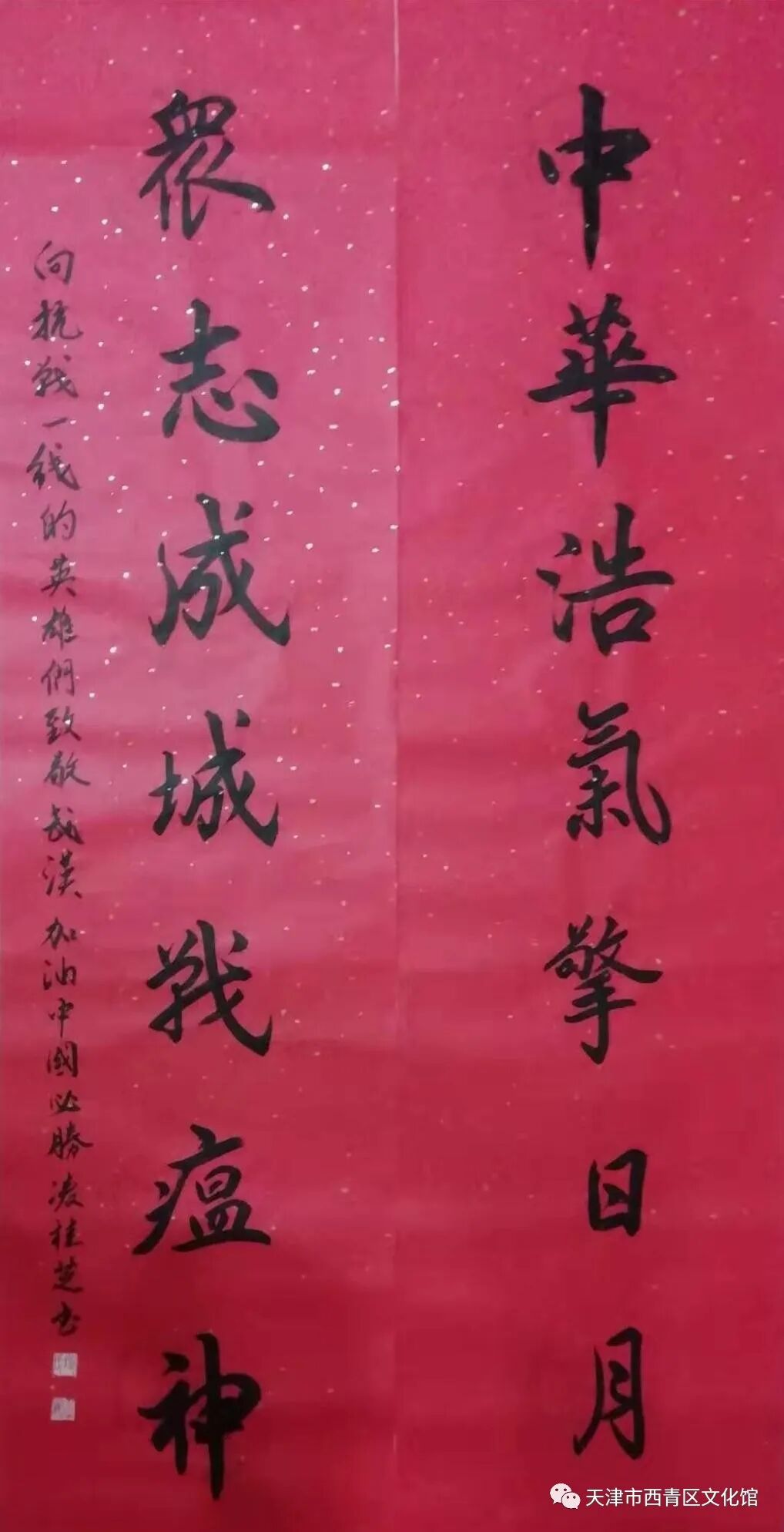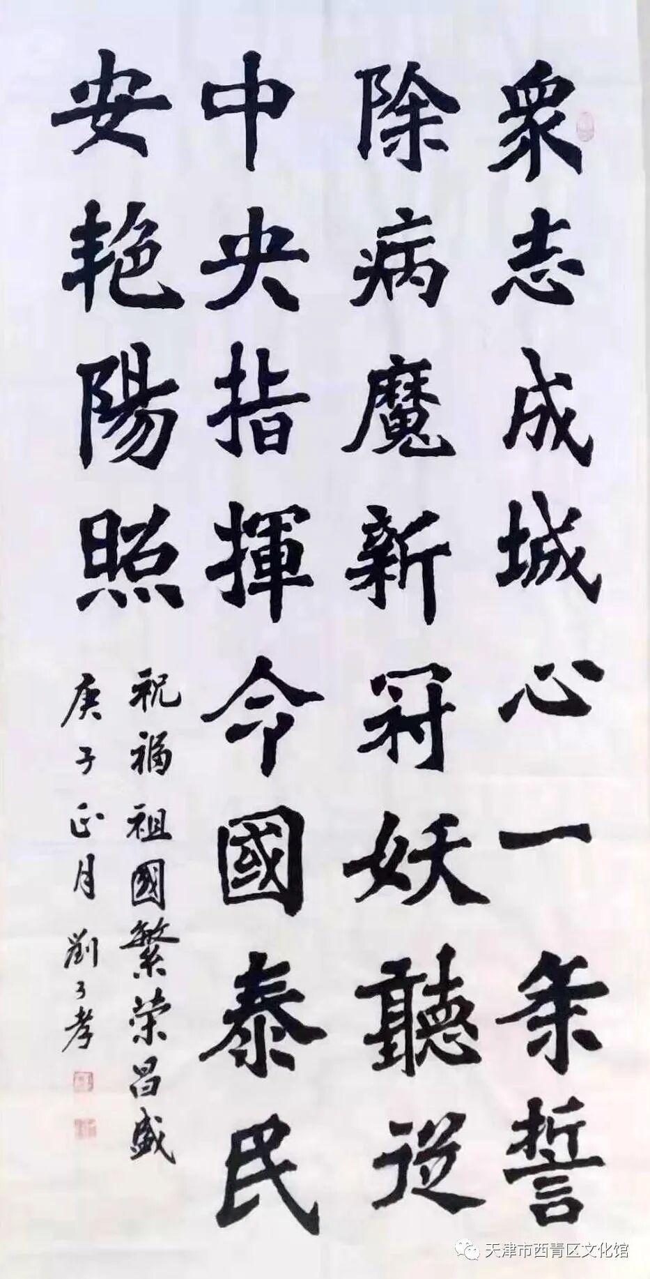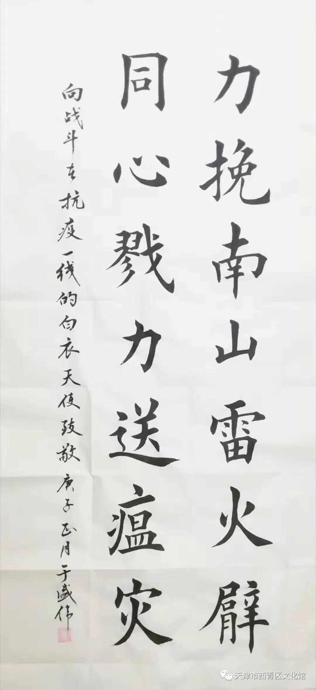 在全国人民积极主动响应党中央的号召,按照区委区政府的统一部署万众一心抗击新冠病毒之际,西青区各基层书画院积极行动起来,组织书法骨干作者,用坚定的信念和热情的笔墨,以书法作品形式,讴歌奋战在疫情防控一线的白衣天使和工作人员的感人事迹,表达西青人民群众众志成城,打赢抗击新冠病毒的坚毅决心。 精武镇书画院成立于2015年,现有一百六十余位书画爱好者。多年来书画院积极参加西青区各项文化公益活动。在此次抗击疫情活动中,书画院组织十余位书法骨干作者积极创作,用笔墨为鼓舞全区人民抗击病毒疫情助力。 作者 靳文林 ![]() 释文: 大爱无疆 作者 徐玉生 ![]() 释文: 春风杨柳万千条,六亿神州尽舜尧。 红雨随心翻作浪,青山着意化为桥。 天连五岭银锄落,地动三河铁臂摇。 借问瘟君欲何往,纸船明烛照天烧。 作者 邢振帮 ![]() 释文: 国难当头齐协力 万众一心战瘟神 作者 于盛伟 ![]() 释文: 力挽南山雷火臂 同心戮力送瘟灾 作者 凌桂芝 ![]() 释文: 中华浩气擎日月 众志成城战瘟神 作者 刘金城 ![]() 释文: 借问瘟君欲何往 纸船明烛照天烧 作者 马庆宪 ![]() 释文: 克艰战难东西南北有志一同驱逐虎豹 防疫控疾男女老少协力共济铸我长城 作者 刘子孝 ![]() 释文: 众志成城心一条 誓除病魔新冠妖 听从中央指挥令 国泰民安艳阳照 作者 王良玉 ![]() 释文: 千钧棒 |