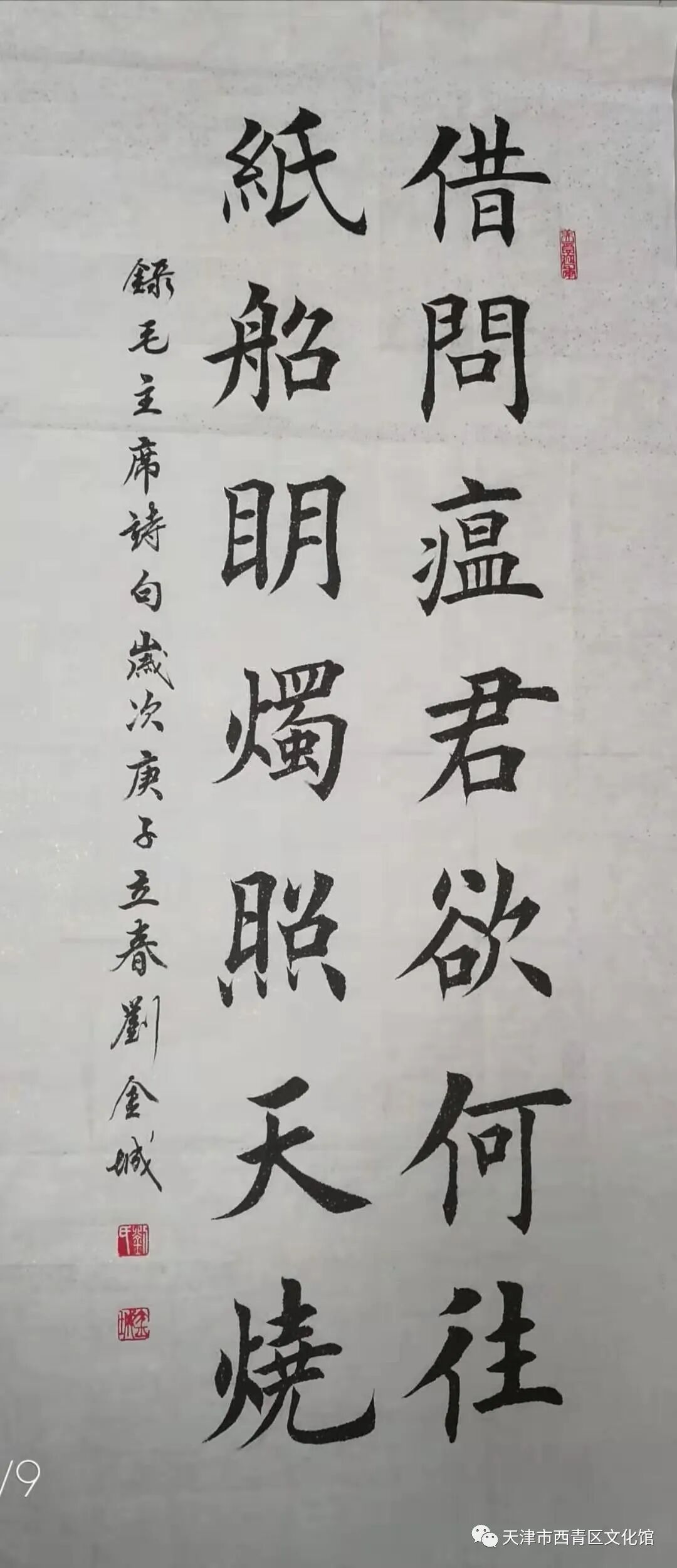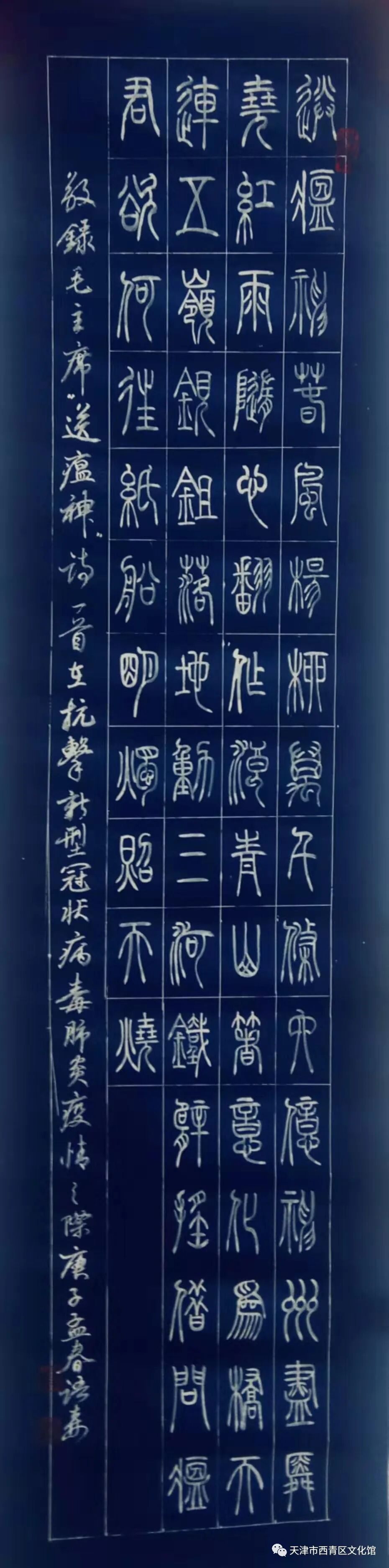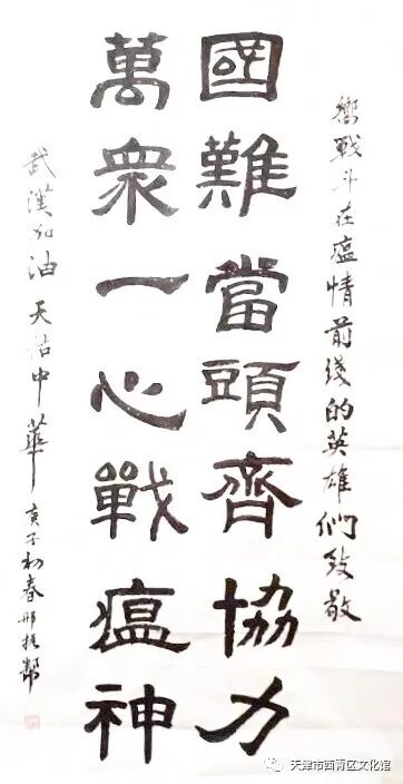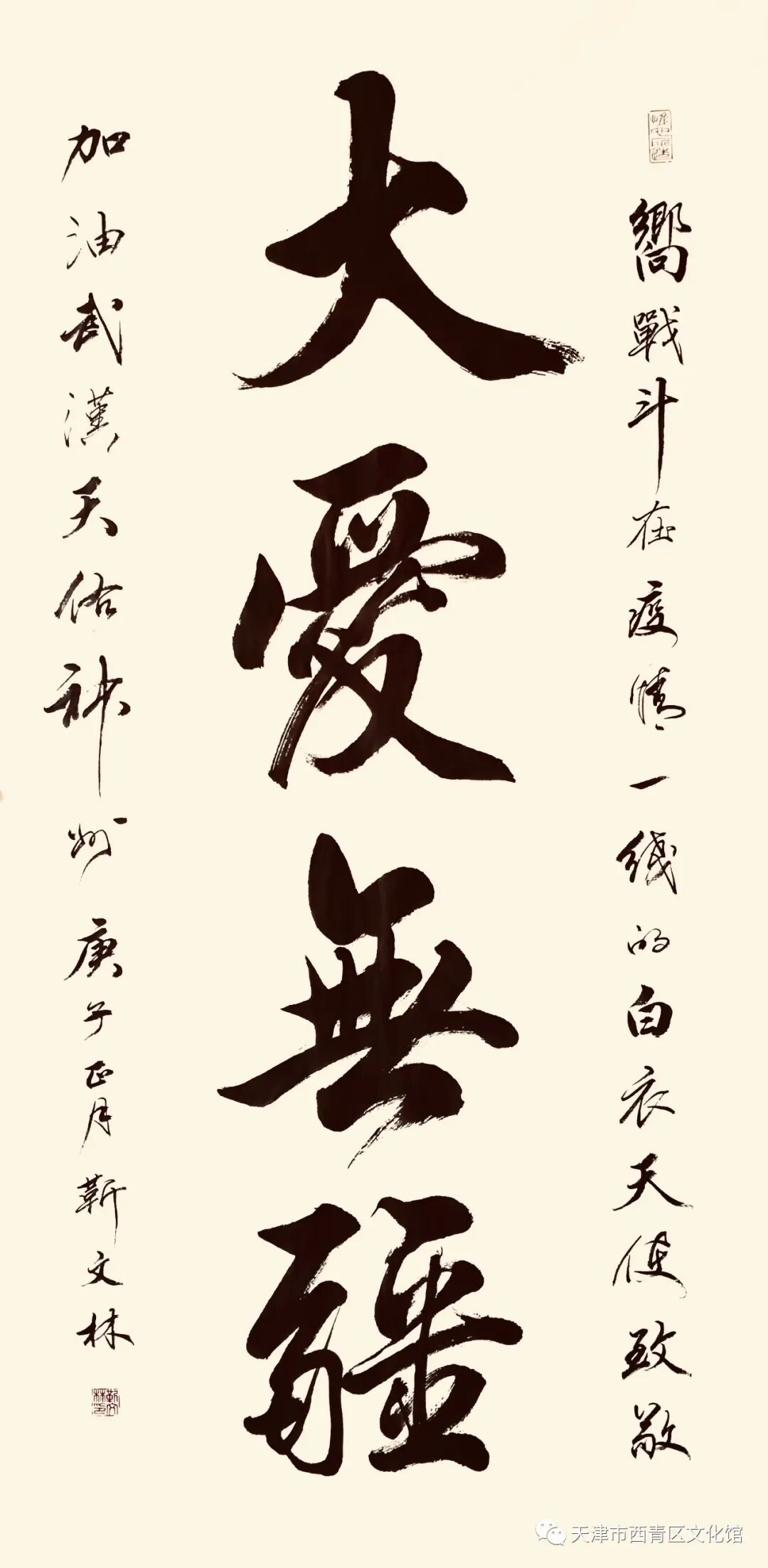 在全国人民积极主动响应党中央的号召,按照区委区政府的统一部署万众一心抗击新冠病毒之际,西青区各基层书画院积极行动起来,组织书法骨干作者,用坚定的信念和热情的笔墨,以书法作品形式,讴歌奋战在疫情防控一线的白衣天使和工作人员的感人事迹,表达西青人民群众众志成城,打赢抗击新冠病毒的坚毅决心。 精武镇书画院成立于2015年,现有一百六十余位书画爱好者。多年来书画院积极参加西青区各项文化公益活动。在此次抗击疫情活动中,书画院组织十余位书法骨干作者积极创作,用笔墨为鼓舞全区人民抗击病毒疫情助力。 作者 靳文林 ![]() 释文: 大爱无疆 作者 徐玉生 ![]() 释文: 春风杨柳万千条,六亿神州尽舜尧。 红雨随心翻作浪,青山着意化为桥。 天连五岭银锄落,地动三河铁臂摇。 借问瘟君欲何往,纸船明烛照天烧。 作者 邢振帮 ![]() 释文: 国难当头齐协力 万众一心战瘟神 作者 于盛伟 ![]() 释文: 力挽南山雷火臂 同心戮力送瘟灾 作者 凌桂芝 ![]() 释文: 中华浩气擎日月 众志成城战瘟神 作者 刘金城 ![]() 释文: 借问瘟君欲何往 纸船明烛照天烧 作者 马庆宪 ![]() 释文: 克艰战难东西南北有志一同驱逐虎豹 防疫控疾男女老少协力共济铸我长城 作者 刘子孝 ![]() 释文: 众志成城心一条 誓除病魔新冠妖 听从中央指挥令 国泰民安艳阳照 作者 王良玉 ![]() 释文: 千钧棒 |