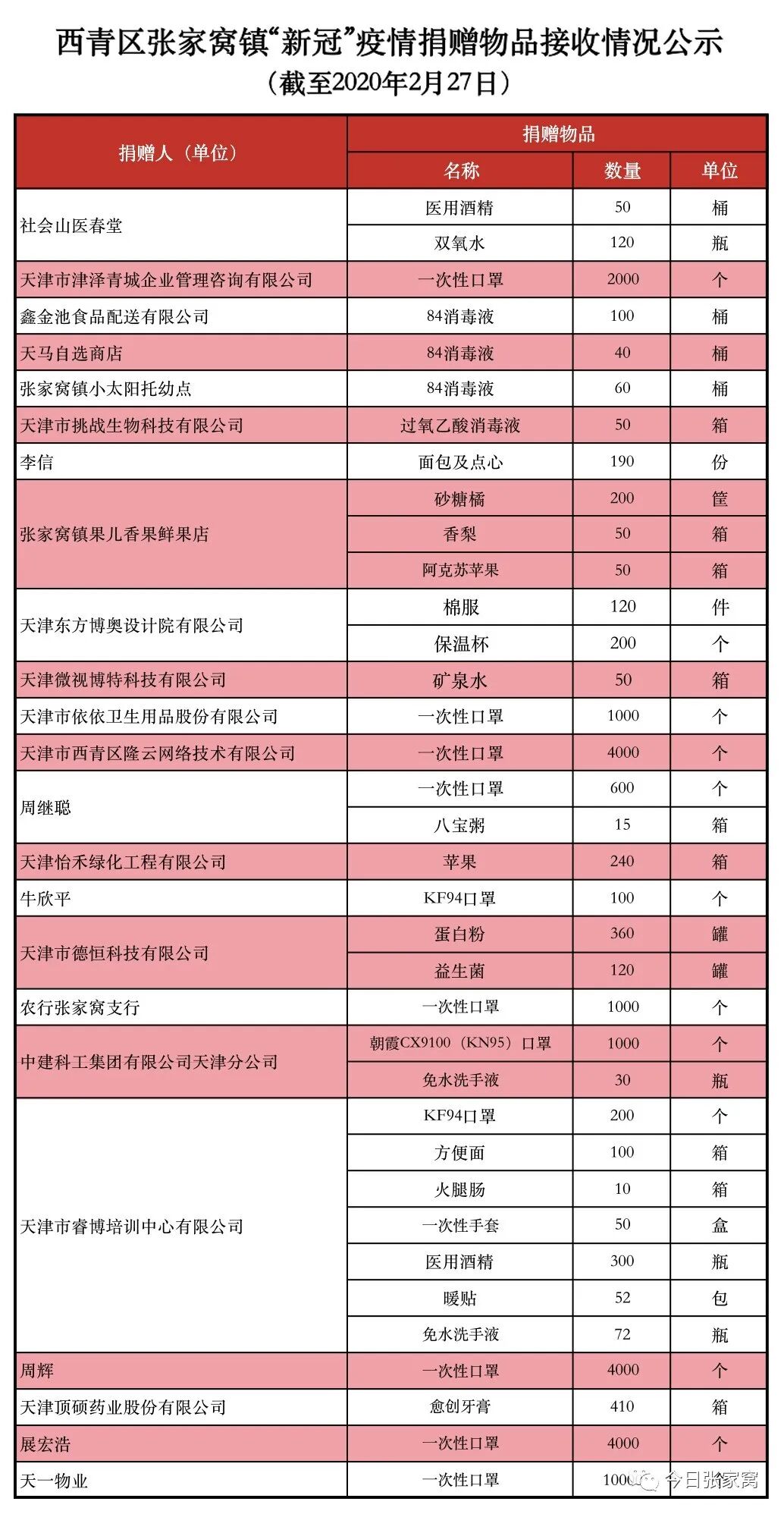 西青区张家窝镇新型冠状病毒疫情防控工作社会捐赠物品接收情况公示 截至2020年2月27日,西青区张家窝镇新型冠状病毒感染的肺炎疫情防控工作指挥部物资储备组累计接收社会捐赠物品23笔,预估价值104.473万元。现公示如下: ![]() 西青区张家窝镇新型冠状病毒感染的肺炎疫情防控工作指挥部向爱心单位、人士致敬! 西青区张家窝镇新型冠状病毒感染的肺炎 疫情防控工作指挥部物资储备组 2020年2月27日 |