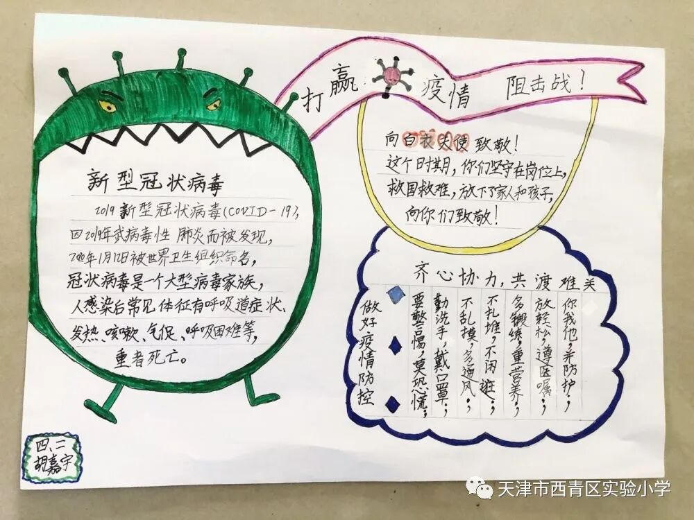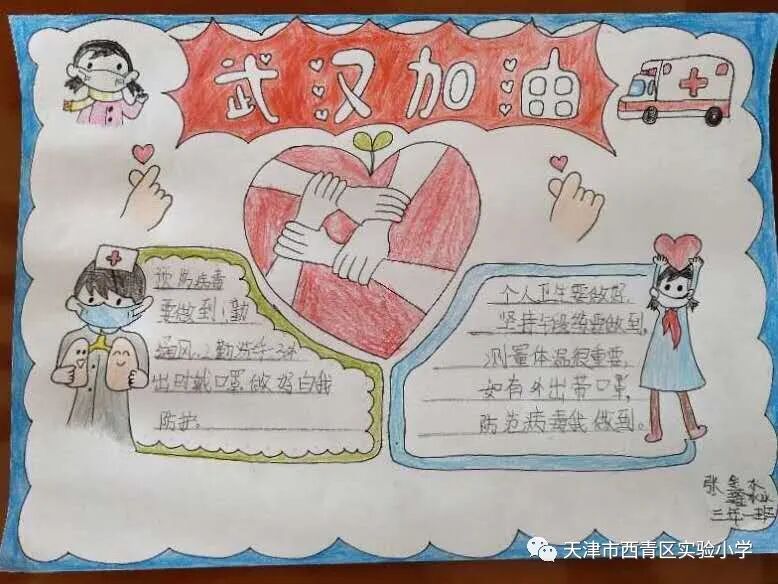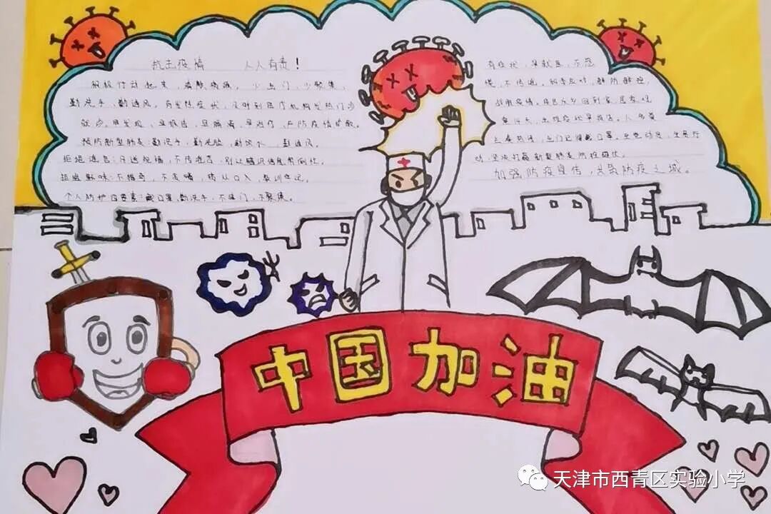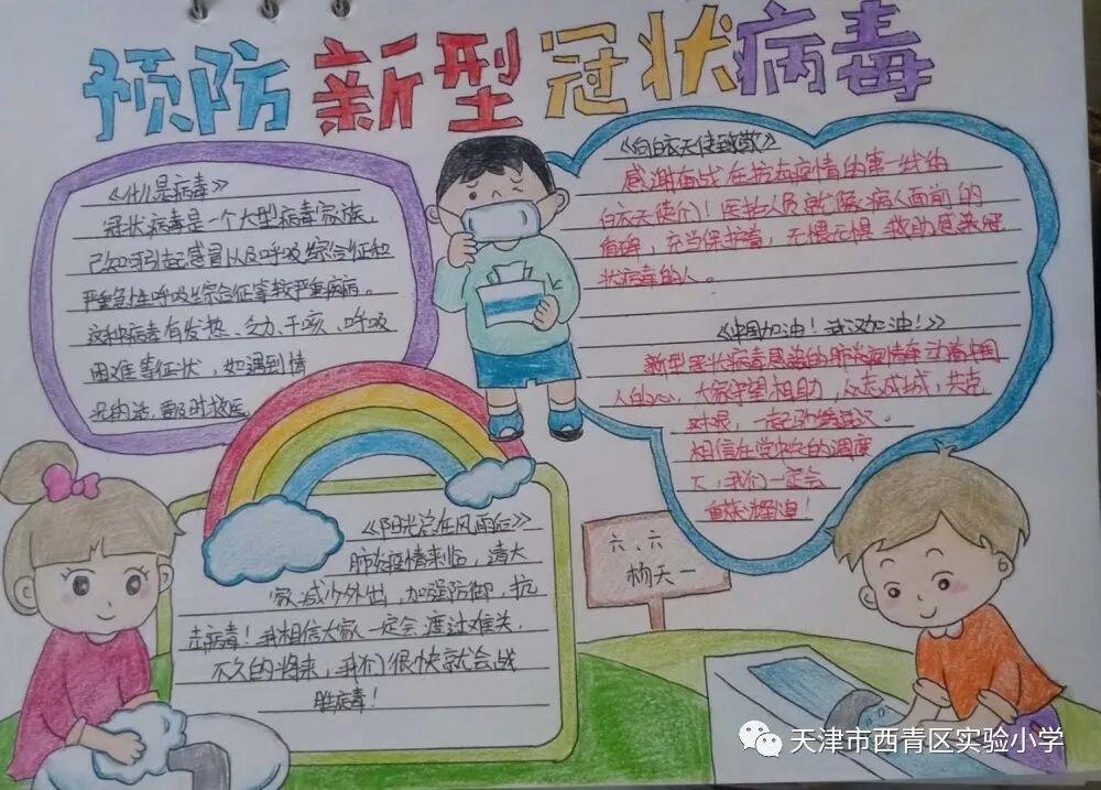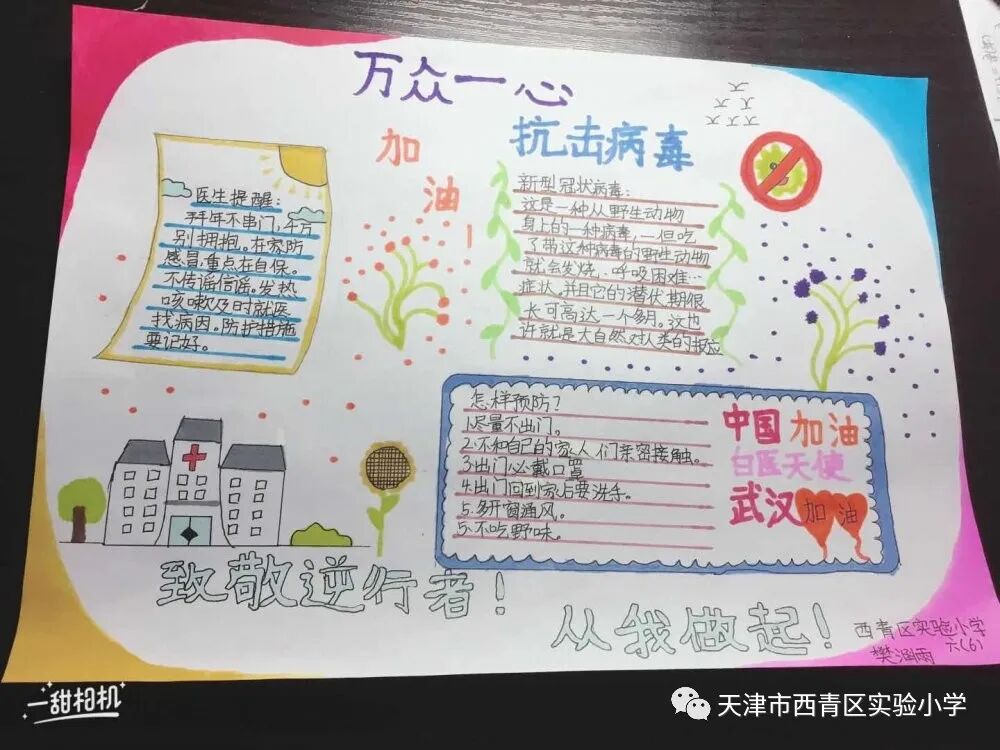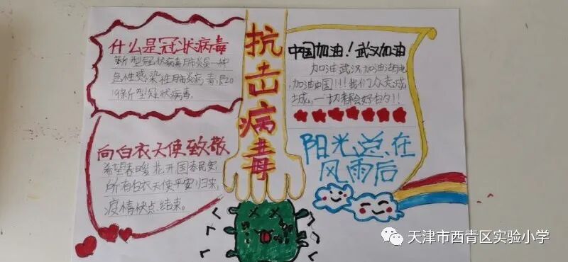 亲爱的同学们,一场突如其来的新冠肺炎疫情阻挡了我们开学的脚步,我们积极响应党中央的号召,宅在家里不出门,不给奋战在抗击疫情一线的叔叔阿姨、爷爷奶奶们添麻烦,但是作为社会主义的接班人我们也要积极参与这场防疫阻击战,我们每天在家里认真收看新闻、了解疫情的实况信息;我们利用这段时间看课外书、增长见识;我们按老师的要求准时学习,锻炼身体;我们和爸爸妈妈一起做家务、做美食,锻炼自理能力;我们更积极的加入到学校“为祖国加油 万众一心抗疫情”争做实小多彩之星活动,精心创作我们的作品,为抗疫奉献我们的微薄之力。下面就请欣赏我们实小学子原创作品集之——手抄报篇! ![]() 六年六班 杨天一 ![]() 六年六班樊涵 ![]() 二年六班 流曦悦 ![]() 六年六班 赵雪彤 ![]() 四年二班 庞雨坤 三年四班 张梓晨 ![]() ![]() 五年二班王婧怡 五年三班郝洁 ![]() 致敬最美逆行者 ![]() 四年二班 胡嘉宁 ![]() 四年二班 徐欣雅 祝福篇 ![]() 一年五班 杜雨鑫 ![]() 二年六班 毕恩俊 ![]() 六年一班 王嘉伊 ![]() 六年二班 张僮芮 ![]() 三年一班 刘安叙 ![]() ![]() ![]() 二年三班 陈昊霖 ![]() 三年一班 张鑫淼 ![]() 二年六班 刘佩泽 |