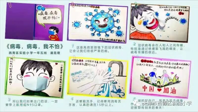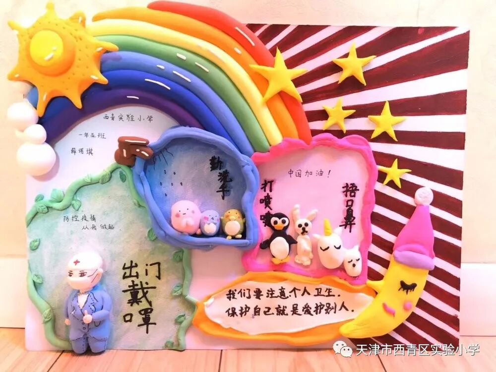 多彩之星 亲爱的同学们,一场突如其来的新冠肺炎疫情阻挡了我们开学的脚步,我们积极响应党中央的号召,宅在家里不出门,不给奋战在抗击疫情一线的叔叔阿姨、爷爷奶奶们添麻烦,但是作为社会主义的接班人我们也要积极参与这场防疫阻击战,我们每天在家里认真收看新闻、了解疫情的实况信息;我们利用这段时间看课外书、增长见识;我们按老师的要求准时学习,锻炼身体;我们和爸爸妈妈一起做家务、做美食,锻炼自理能力;我们更积极的加入到学校“为祖国加油 万众一心抗疫情”争做实小多彩之星活动,精心创作我们的作品,为抗疫奉献我们的微薄之力。下面就请欣赏我们实小学子原创作品集之——亲子制作篇! 一年五班 杜雨鑫 ![]() 作品名称:中国速度——火神、雷神的崛起! 学校:西青实验小学 班级:一年五班 姓名:杜雨鑫 创意诠释: 响应全国“双有”组委会“不寻常的假期时光”亲子活动的号召,利用闲置塑料瓶、竹签、布头、鞋盒等材料,爸爸妈妈与孩子共同创作了这幅作品。意在表现抗击疫情特殊时刻,我们祖国响应速度之快、实力之强大。同时也丰富了孩子的假期生活,锻炼孩子的动手能力。我们相信春天已至,抗击疫情的胜利指日可待,天佑中国、中国必胜! 一年五班 潘晁君 ![]() 作品名称:《病毒,病毒,我不怕!》 学校:西青区实验小学 班级:一年五班 姓名:潘晁君 创意诠释: 响应全国“双有”组委会“不寻常的假期时光”亲子活动的号召,爸爸妈妈与孩子共同创作了这幅作品。通过了解新型冠状病毒的传播途径和预防知识,帮助我们科学应对疫情。面对来势凶猛的新型冠状病毒,我们有着战胜困难的钢铁般决心,一张张用信念和希望织成的网,铸成抗击疫情坚固的防线。中国必胜! ![]() 生命似雨后彩虹 我是西青区实验小学一年五班薛诺琪,为响应全国“双有”组委会“不寻常假期时光”亲子活动的号召,用超轻粘土和儿童画的结合,跟妈妈一起创作了这幅作品。抗击疫情从我做起,要做到,多通风、勤洗手、少出门、戴口罩,做好个人防护,让我们共同助力疫情防控狙击战!坚信风雨过后,一定会看见彩虹!加油中国! |