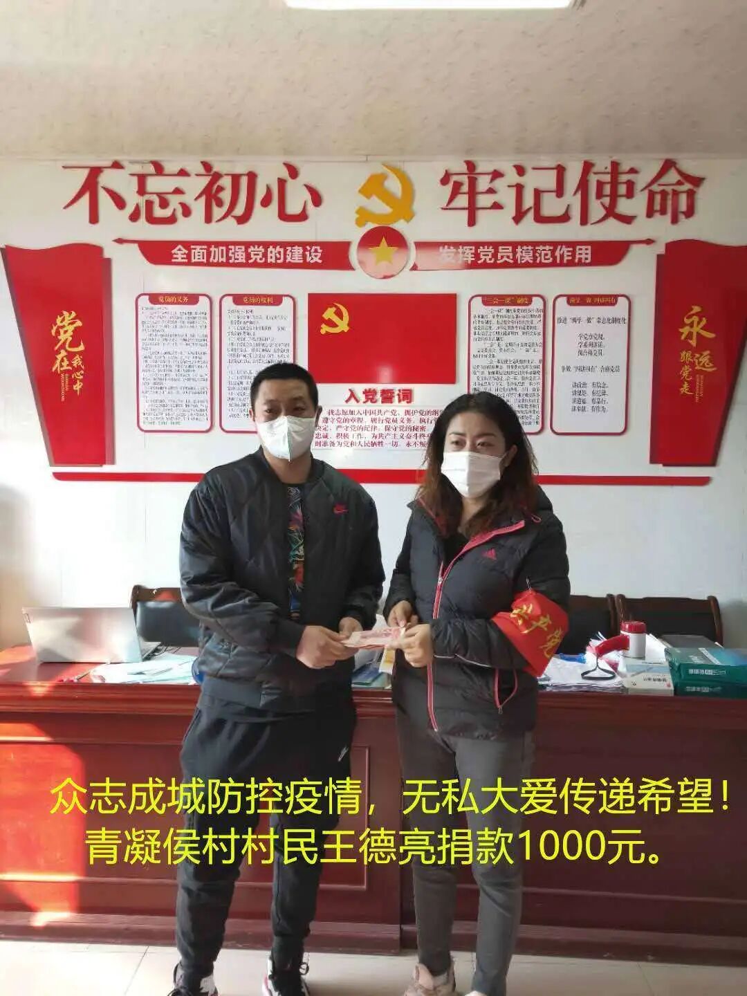 王金和的儿子和儿媳同样也在驻守防疫一线。儿子王德亮,今年33岁,没有复工之前,一直在村里卡口处执勤,能和父亲一同值守卡口,守护村民,王德亮特别自豪,他常说,“我们就是上阵父子兵,一同守护青凝侯”。儿媳李月玲是大寺镇综合便民服务中心的一名职员,她从大年初三便返回工作岗位,积极投身疫情防控工作,因便民服务窗口暂时未对外开放,李月玲就到社区参与一线执勤,至今没有休息一天。她还同丈夫一起为青凝侯村防疫工作捐款1000元和10箱牛奶。李月玲说:“我是党员,现在就是要冲锋向前,保护好群众的生命安全,哪里有需要,我就听组织安排去哪儿执勤。”
