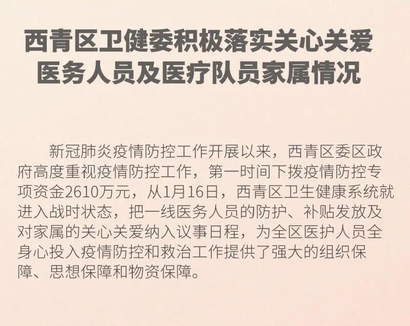 ![]() 一、关心一线医务人员,落实各项保障政策 1.加强组织领导为一线人员投保。西青区卫健委党委坚持科学统筹与突出重点相结合、主动对接与精准保障相结合、落细落实与高效推进相结合,加强与区总工会、团区委、区妇联的沟通,合力推进保障工作。委工会印发了《进一步做好一线医务人员及其家属保障工作的实施方案》和《关于拨付卫健系统各基层工会疫情防控专项慰问金的通知》,成立以委主要领导为组长的专项工作领导小组。在防控工作开展初期就积极施策,协调中国人寿西青分公司为全区卫健系统1259名医务和防疫人员免费投国寿绿洲团体意外伤害保险,保额为每人10万元。协调联通公司为30名支援湖北医务人员每人提供520元电话补贴,移动为支援湖北医务人员减免电话费。 2.及时发放临时性工作补助。1月26日,接到市财政局、市卫健委津财社[2020]8号文后,1月27日,向西青医院、疾控中心发出通知,要求及时发放临时性工作补助,从1月31日第一批补贴发放至今,共为793人次发放补贴109.13万元。其中,西青医院发放76.53万元,疾控中心发放32.6万元。 3.内外结合做好心理疏导。西青医院于2月12日进一步完善《疫情防控工作方案》,下设心理疏导组,将心理医生李鑫的电话在医疗系统内公布,开通内部心理辅导热线;区卫健委要求各医疗机构依托市精神卫生中心心理援助平台,为医务人员提供心理疏导,开展医务人员心理健康评估,有针对性地开展干预和心理疏导;2月18日,联合天津大学心理健康教育中心设立心理援助热线4001001895,对我区医务工作者及广大人民群众提供疫情应对期间心理援助服务。 4.核增绩效工资总量、发放卫生防疫津贴、一线医务人员职称评聘。市政府办公厅下发《关于保障和关爱新冠肺炎疫情防控一线医务人员若干措施的通知》后,由人社局牵头会同卫健委和财政局已经制定了我区的工作方案,今天区防控指挥部召开会议,将研究通过,文件下发后,我们将会认真制定卫健委的工作方案,及时兑现各方面待遇和津贴补贴。在疫情防控期间,我们卫生健康系统择优提拔处级干部1名,科级干部3名。 5.全方位加强一线慰问。区委区政府对一线工作人员极为关心,李清书记、凤祥区长先后数次不分白天黑夜到西青医院发热门诊、区疾控中心、集中隔离医学观察点、九个高速公路卡口慰问医护人员,在1月26日,第一批支援湖北医疗队出发时,区指挥部副总指挥董秀琴、高艳代表李清书记、凤祥区长送行,送去了区委区政府和全区人民的关怀和嘱托,并通过微信送去了慰问;正月十五,区长白凤祥与支援湖北人员进行了视频连线,以娘家人的身份为前线的医务人员送去了慰问,让远在千里之外的一线医护人员感到暖心团圆。同时,向西青医院、疾控中心、各社区卫生服务中心和妇儿中心工会拨付慰问金共计60.6万元,用于慰问坚守防疫工作一线的工作人员。为30名支援湖北人员、1名海河医院医务人员每人发放慰问金5000元;为180名一线医务人员购买500元慰问品;使用市卫健委工会拨付资金,为16名支援湖北人员发放慰问金每人5000元。 6.挖掘典型及时表彰。区防控指挥部高度重视疫情防控工作中一线工作人员的典型培养,及时予以表彰,先后对集中隔离观察点和西青医院发热门诊、9个高速路口98名医务人员予以通报表扬。2名同志被评为天津市敬业奉献好人。利用健康西青微信公众号,积极推送各基层单位的先进典型事迹、特色亮点工作、经验做法等,疫情防控以来共发布信息报道385篇,行业内经验做法和先进典型宣传47篇,多篇报道被西青融媒体、健康中国等微信公众号转发,中央电视台专门报道了我区疾控中心的先进事迹。 二、关爱医疗队家属,靶向对接精准帮扶 1.落实台账管理确保保障全覆盖。为每名支援湖北、海河医院的医疗队员、西青区发热门诊、疾控人员和1号集中隔离点医务人员建立台帐,详细登记每个家庭成员情况,仔细询问每个家庭各自存在的困难,做到底数清、情况明,确保各项保障服务不少一户、不落一人,截至目前已完成建档211人。 2.建立联系卡细化服务保障。按照一线医护人员居住地,为我区支援湖北人员和一线医务人员家属发放服务联系卡,并在联系卡上明确了工会干部、青年志愿者、巾帼志愿者、心理咨询、出行服务等有关信息的联系人、联系方式,确保家属遇事有人找、困难有人帮。 3.主动了解需求做到精准服务。安排支援湖北队员们所在单位工会干部,采取入户访视、打电话、微信等多种沟通方式,及时向队员们及家属发放工会服务联系卡、“四无忧”爱心卡和“一封信”,详细了解其家属的需求和困难并积极解决。当接到一位家属对防护用品的需求后,积极协调委物资保障组和西青医院,在物资紧缺的情况下抽挤一批一次性口罩、手套、手消液等防护用品,由分管副区长、卫健委主要领导、工会主席带队为每名队员家属进行配发,并送去价值500元慰问品。支援湖北的医生贾翠婷有一对刚刚两周岁的双胞胎女儿,丈夫在家面临返岗工作、照顾老人和孩子不能兼顾的两难处境,委工会获悉后积极沟通区总工会、区妇联等相关部门共同处理,协调其爱人的工作单位允许其居家在线工作,目前已得到妥善解决,家属非常满意。 4.切实落实资金保障确保物资发放到位。副区长高艳分2次对支援湖北的医护人员家属进行了慰问,