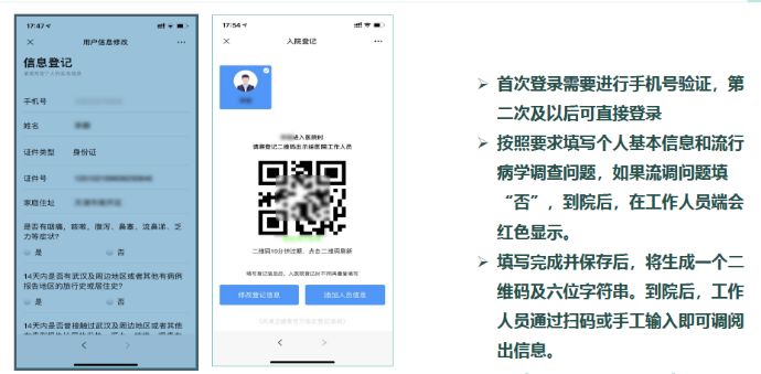 2020年2月26日天津市卫健委推出了新版的医疗机构入院扫码登记系统,取消原有入口二维码,统一启用新版二维码。我院门诊服务中心和网络信息科强强联手,于2月27日下午在急诊入口、住院入口启用了新版二维码。 打开微信“扫一扫”功能或者健康天津APP的“入院登记功能 ![]() 入院登记二维码 如何操作呢?扫码后 ![]() 新版本有哪些变化呢? ![]() ![]() 遇到问题怎么办呢? ![]() 如果您之前进入过我院,扫码后可选择修改登记信息,完成流行病学史登记,并将二维码出示给我院入口登记工作人员。 ![]() 如果您要为家人登记可选择添加人员信息,进行基本信息和流调信息录入,完成后会生成您家人的二维码,一同出示给工作人员即可。 ![]() 二维码有效时间为10分钟哦,超过后请您点击一下二维码进行刷新即可。 为了避免人员聚集,您可以选择健康天津APP、科瑞泰Q医APP、天津市西青医院微信公众号、电话预约(022-27960482)等多种途径预约就诊。请您到院后选择自助机或人工窗口进行预约报到,如需帮助请告诉现场工作人员您要“取号”即可。自费患者手机端可进行缴费,但医保患者不支持手机医保支付,敬请谅解。 ![]() 门诊服务中心全体工作人员竭诚为您服务! |