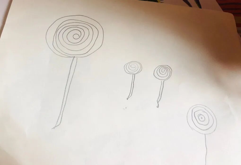 可爱的孩子们将画好的四支棒棒糖分别进行了“派送”:一支是妈妈的,一支是蓓蓓(姐姐)的,一支是茜茜(妹妹)的,一支是送给阿姨(青年志愿者)的。