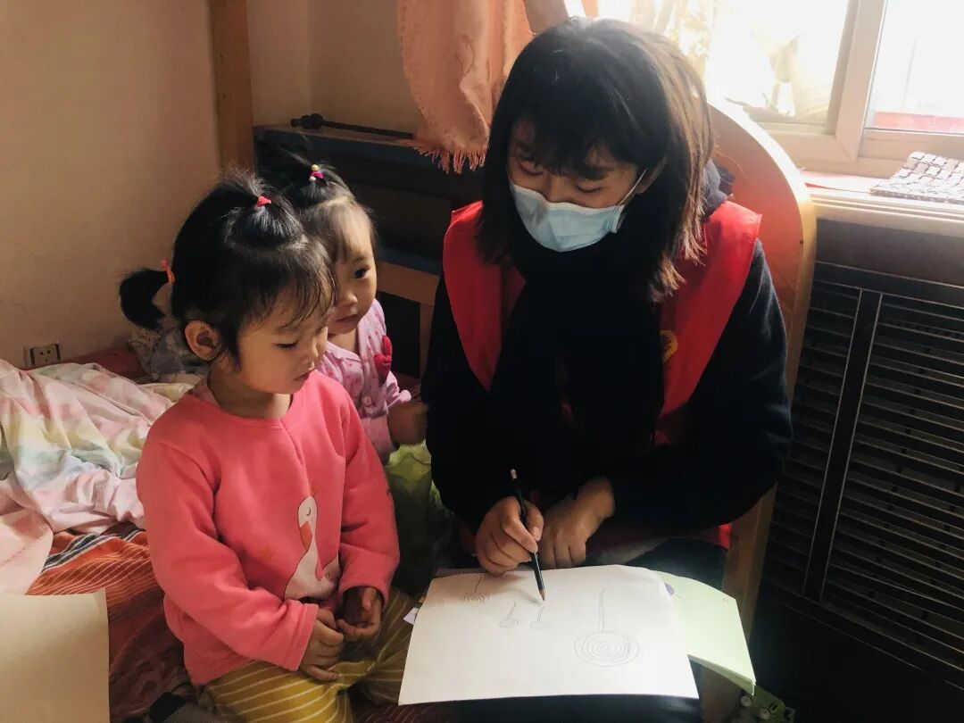 青年志愿者们同乖巧的宝宝一起画画、给她们讲故事,现场氛围十分温馨。孩子们的奶奶告诉志愿者,孩子的妈妈去武汉后,虽然她们只能通过视频和妈妈相聚,但是却很少有哭闹,一直非常懂事听话,并且希望妈妈在武汉照顾好身体,一定要戴口罩。