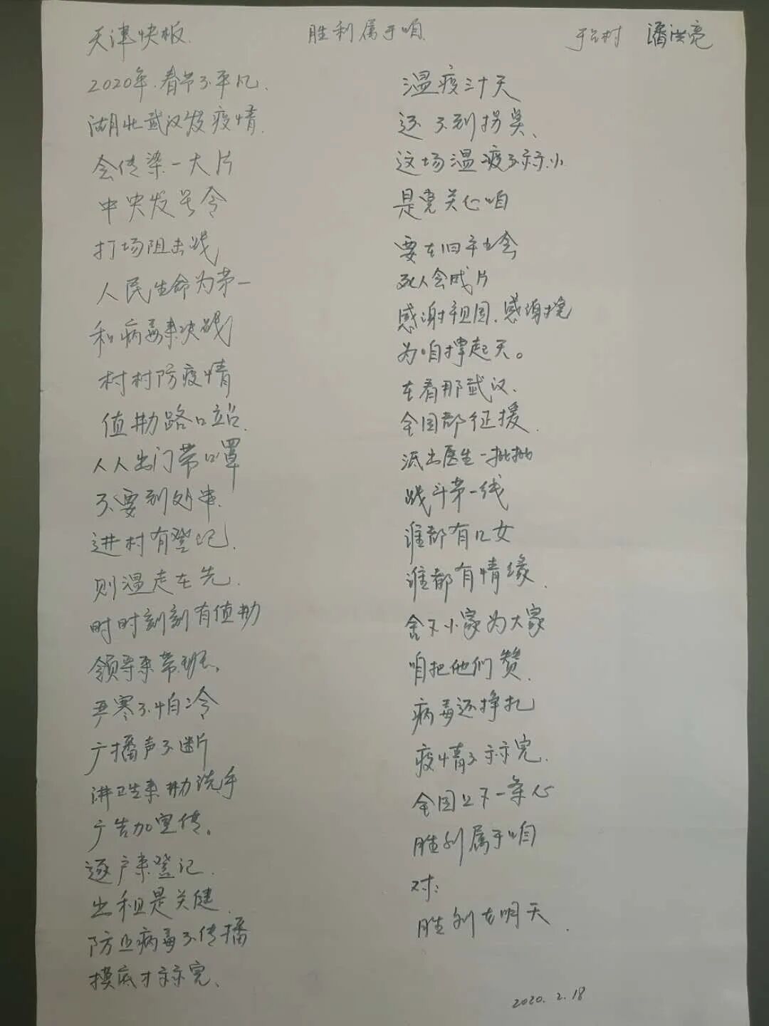 “人民生命为第一和病毒来决战,村村防疫情,值勤路口站,人人出门带口罩,不要到处串..... ”。3月5日学雷锋日到来之际,于台村68岁的文化志愿者潘宏亮自编自演天津快板《胜利属于咱》献给奋斗在防控疫情一线最可爱的人们。通俗易懂的语言,津味十足的腔调,传播了正能量,也为大家送去了疫情防控知识。 疫情需要,潘大爷减少外出,宅在家中,心却牵挂着疫情防控一线。“疫情防控一线的工作人员很辛苦,我从心底有感而发,发挥文化志愿者的作用,用一天时间创作完成这首天津快板,正值3月5日学雷锋日,借此机会,宏扬志愿服务精神,宣传疫情防控知识”,潘大爷说。 ![]() 疫情防控期间,出于安全和健康考虑,文化中心、图书馆等场所暂时关闭,线下文化活动也都取消。为丰富居民宅家生活,李七庄街广大居民群众利用微信平台、抖音等多种形式,展示书法、绘画、舞蹈等才艺,传递温暖力量,坚定打赢防控疫情阻击战的信心。 |