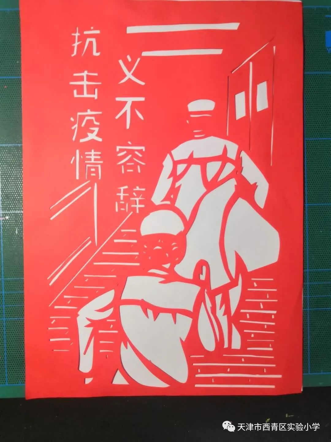 ![]() 原创作品 剪纸 疫情期间,我们实验小学美术剪纸社团的同学们在赵群老师的指导下,艺剪飞扬,剪刻出张张作品,用自己的方式,向奋战在抗“疫”一线的医护人员、人民解放军、公安干警、基层工作者们致敬。一张红纸,一把剪子,一把刻刀,专注的神情,认真的态度,承载着孩子们战胜疫情的决心和信念。武汉必胜!中国必胜! ![]() 班级:三年二班王梦琪 作品名称:《口罩下最美的人》 一场突如其来的疫情使我们都戴上了口罩,遮住了小女孩那美丽的脸庞和开心的笑靥,但是遮不住我们善良温暖的心灵,自我保护就是爱护他人,期待疫情快点过去,春暖花开时,摘掉口罩的我们,重新绽开笑脸,毫无阻碍的拥抱春天!希望这一天早日到来,武汉加油!中国加油! ![]() 三年二班,安宏胤 作品名称:科学防护 2020年这个春节因为疫情变得不寻常。抗击疫情,从我做起,勤洗手,好心态,戴口罩,常通风,科学防护,坚决打赢抗击疫情阻击战! ![]() ![]() 三年二班,安宏胤 作品名称《白衣天使》 你们在看不见硝烟的战场上,把生命之光再次点燃,有一种付出是用生命做代价,用生命呵护的生命,显得高贵而无比坚强,亲爱的白衣天使们,在抗击疫情的战争中,你们圣洁而伟大的付出,让我们这个世界,充满了阳光,充满了爱!向白衣天使们致敬! ![]() ![]() 三年二班李思颍 名字:家(舍小家,顾大家) 为了大家的健康和安全,多少人奋战在抗疫一线!他们舍小家,为得是国家,为得是大家。我们要珍惜这些逆行者为我们创造的安稳的生活,无事少出门,不聚会,我们就是要宅在家里,坚持就是胜利!在这个特殊的假期里,我们要坚决打赢疫情防控阻击战,抗击疫情,人人有责,向一线工作的人员说一声:您们辛苦了!希望您们早日平安回家。 ![]() ![]() ![]() 三年一班 宋朗溪 作品名称《无畏逆行》 疫情当前,白衣战士毫不畏惧地冲向前线,义无反顾地坚定逆行,与病毒对抗,他们用自己的血肉之躯,托起了无数生命的希望。他们为我们擎起了一片天!致敬逆行者,致敬武汉!中国,加油! ![]() ![]() 三年一班 宋朗溪 作品名称《誓言》 在肺炎疫情面前,所有奋战在一线的医护人员就是我们的英雄,无数的白衣天使无惧无畏地投身抗战疫情的火热斗争中,她们保持积极奋进的状态,只为在这场疫情抗争中赢得胜利。抗击疫情,不忘初心,牢记使命,尽显医者担当。 ![]() ![]() 三年一班 刘安叙 作品 《勤洗手》 抗击疫情,人人有责!作为一名小学生,此时的我,不能冲锋上前,但是我每天乖乖地待在家里,不外出,勤洗手,讲卫生,不给大人添麻烦,这也是为抗击疫情做贡献!我还要拿起剪刀,剪刻抗疫题材的剪纸作品,为抗疫一线的叔叔阿姨们加油鼓劲!愿疫情早些过去,一切顺利平安!中国,加油!武汉,加油! ![]() 四年五班 黄壹平 作品名称《院士,可敬的战士》 84岁临危受命,在此时此刻,有一位老人,奔波于抗击新型冠状病毒的最前线!他有院士的风骨,有战士的勇猛,更有国士的担当,没错,他就是钟南山院士!向钟老致敬——您辛苦了,全国人民感谢您! ![]() 四年五班 黄壹平 作品名称《无名英雄》 中华民族,是伟大的民族。当疫情肆虐,危及全民的关键时刻,总有人站出来为我们遮风挡雨,总有人站出来为我们负重前行,总有人站出来为我们冲在第一线,他们奉献的是温情,是关爱,是汗水,甚至是自己的生命!,他们用自己的血肉之躯,换来千家万户的幸福和安康,换来国家的稳定和富强!致敬,无名英雄——历史的丰碑上将永远铭记你们的功勋!! ![]() 疫情终将被我们消灭,在不久的将来,我们会迎着朝阳,扑向春天的怀抱!期待这一天早日到来! |