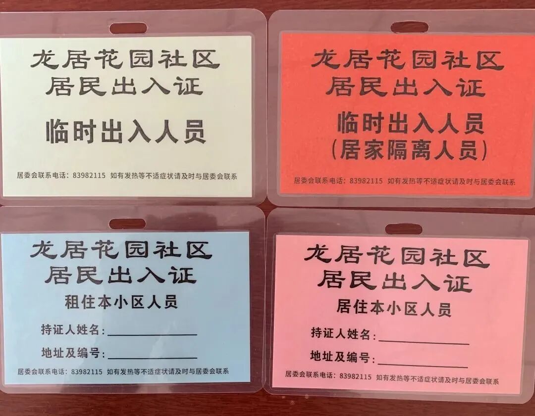 您可别小看了这一张小小的卡片,这是龙居花园社区工作人员根据电话摸排、门禁系统摸排、台账摸排后的统计结果为小区居民专属定制的“出入证”。“出入证”共分为四个颜色:“粉色”出入证代表居住在本小区的居民;“蓝色”出入证代表着租住在本小区的居民;“绿色”出入证代表着临时出入人员,是专门为有些不居住于本小区子女看望老人准备的,以备不时之需;“红色”代表特殊人员紧急情况出入证。出入证的正面标有小区姓名、住户姓名、地址和编号以及居委会电话号等具体信息,出入证上的信息全都是由社区工作人员手写出来的,可谓是“麻雀虽小,五脏俱全”。如果较之前统计时有新增人员,需要居民重新登记后经网格员核查之后才能再领取新增人员的出入证。