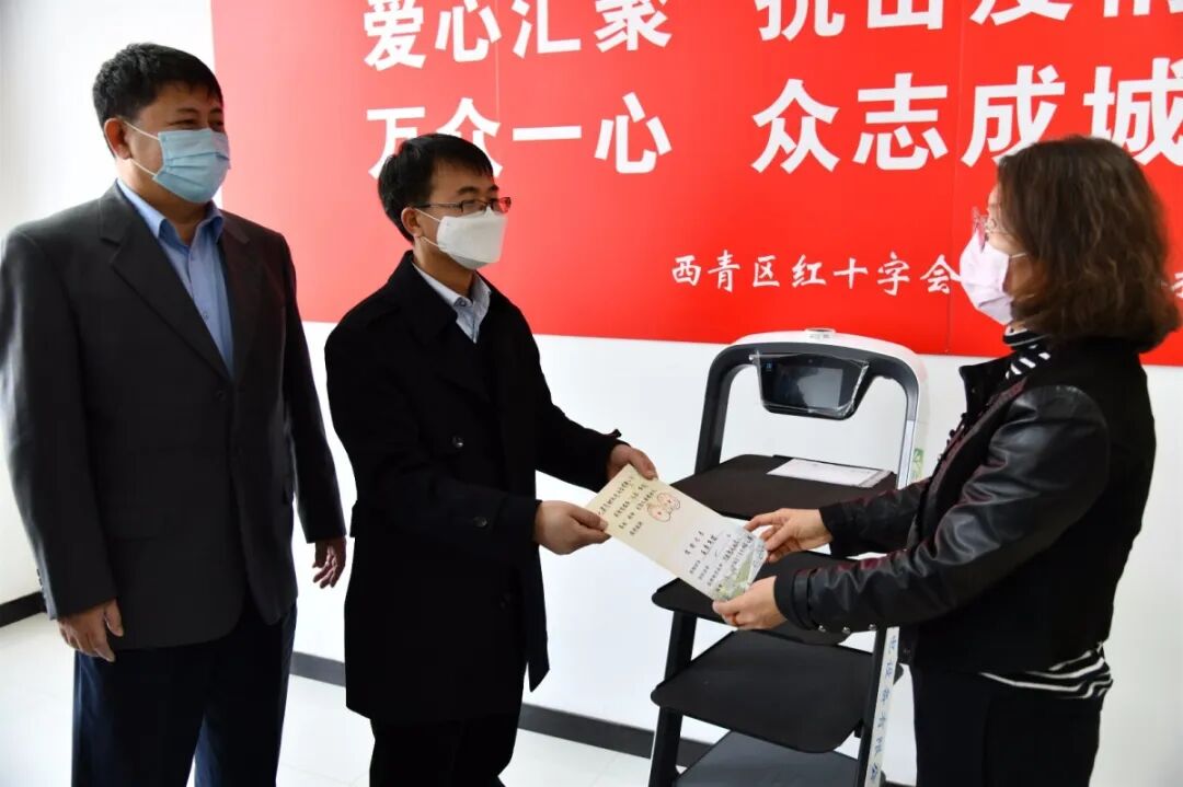 区红十字会负责同志代表区疫情防控指挥部社会捐助组接受了捐赠,并向孟祥杰颁发了感谢状。