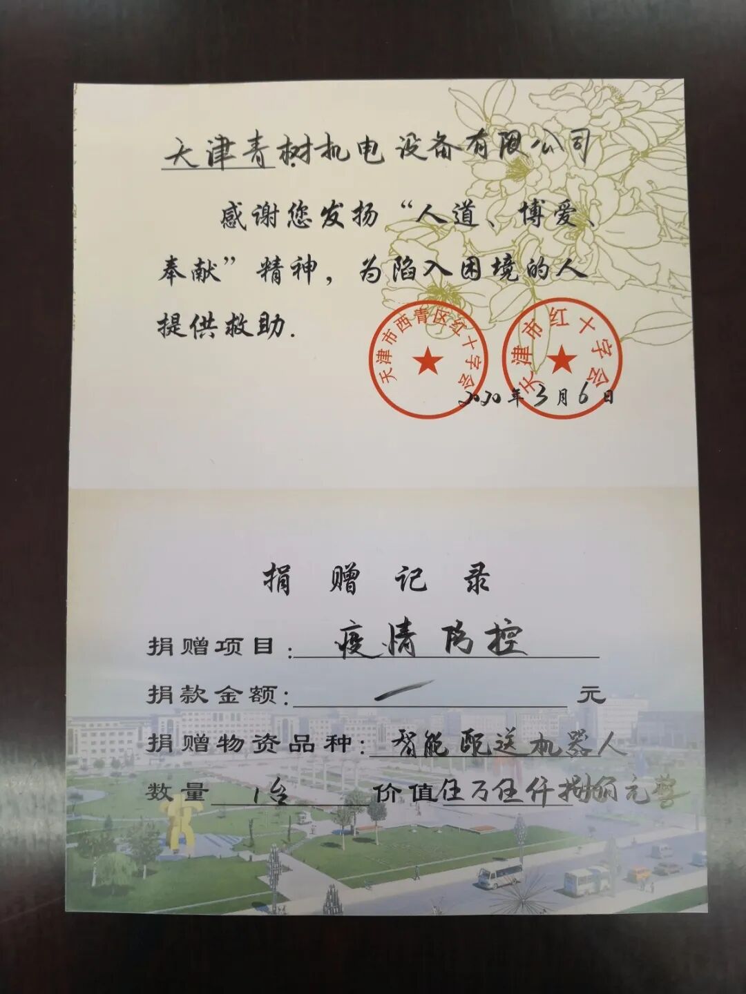 在新冠肺炎疫情防控最吃劲的关键阶段,西青民建会员、天津青树机电设备有限公司总经理孟祥杰心系我区疫情防控工作,近期,经过多方联系、协调和比对选型以及克服运输等诸多困难,由其公司代理销售的一款价值55800元的智能配送机器人以最短的时间快递到天津,并且第一时间向区红十字会进行了捐赠。