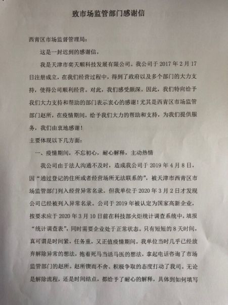 日前,精武镇市场监管所收到天津市奕天顺科技发展有限公司送来的感谢信,就精武所在疫情期间担当作为、积极协调,主动为企业开辟绿色通道,从速从简为企业办理移出异常名录,保障了企业顺利复工复产表示感谢。 ![]() ![]() 经了解,天津市奕天顺科技发展有限公司于2017年2月17日注册成立,2019年4月8日该企业因“通过登记的住所或者经营场所无法联系的”被列入经营异常名录,2020年3月2日该企业发现被列入异常名录,影响了复工复产,该企业向精武所申请移出经营异常名录。接到申请后,精武所以全力服务企业复工为出发点,为企业开通绿色通道,在原有工作流程的要求下,创新核查方式,采用“主体承诺、第三方见证”的形式,在企业承诺登记住所可以重新取得联系的前提下,精武所市场监管干部加班加点,向企业登记住所的所属租赁方进行询问核实,核实情况后及时向市市场监管委提出申请,仅用2天时间完成企业经营异常名录移出工作,为企业复工复产争取了时间。该企业对精武所的高效服务给予高度评价:“疫情无情人有情,共克困难见真情,争分夺秒业务强,严谨高效解异常”。 |