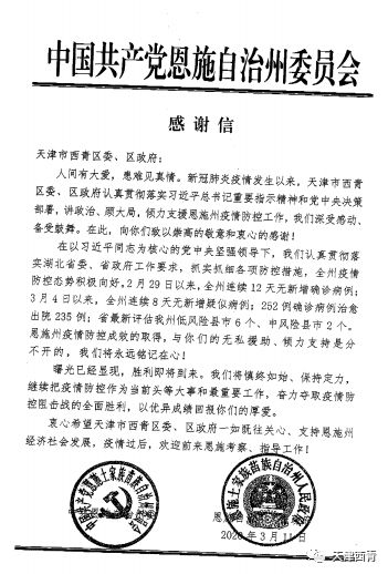 人间有大爱,患难见真情。新冠肺炎疫情发生以来,天津市西青区委、区政府认真贯彻落实习近平总书记重要指示精神和党中央决策部署,讲政治、顾大局,倾力支援恩施州疫情防控工作,我们深受感动、备受鼓舞。在此,向你们致以崇髙的敬意和衷心的感谢!