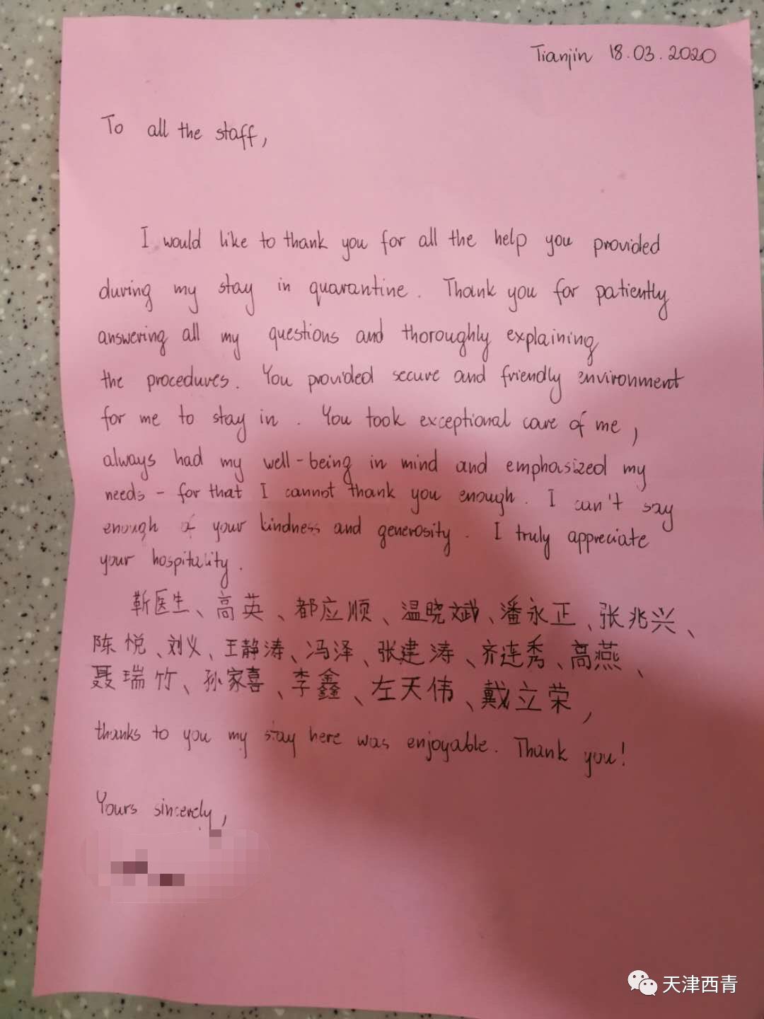近日,西青区1号隔离观察点陆续收到解除隔离观察人员送来的锦旗和多封的感谢信。“战疫勇士、守护天使”、“看不清你们的脸,却处处感受着温暖和爱。”、“因为你们,我在这儿很愉快。谢谢你们!”……