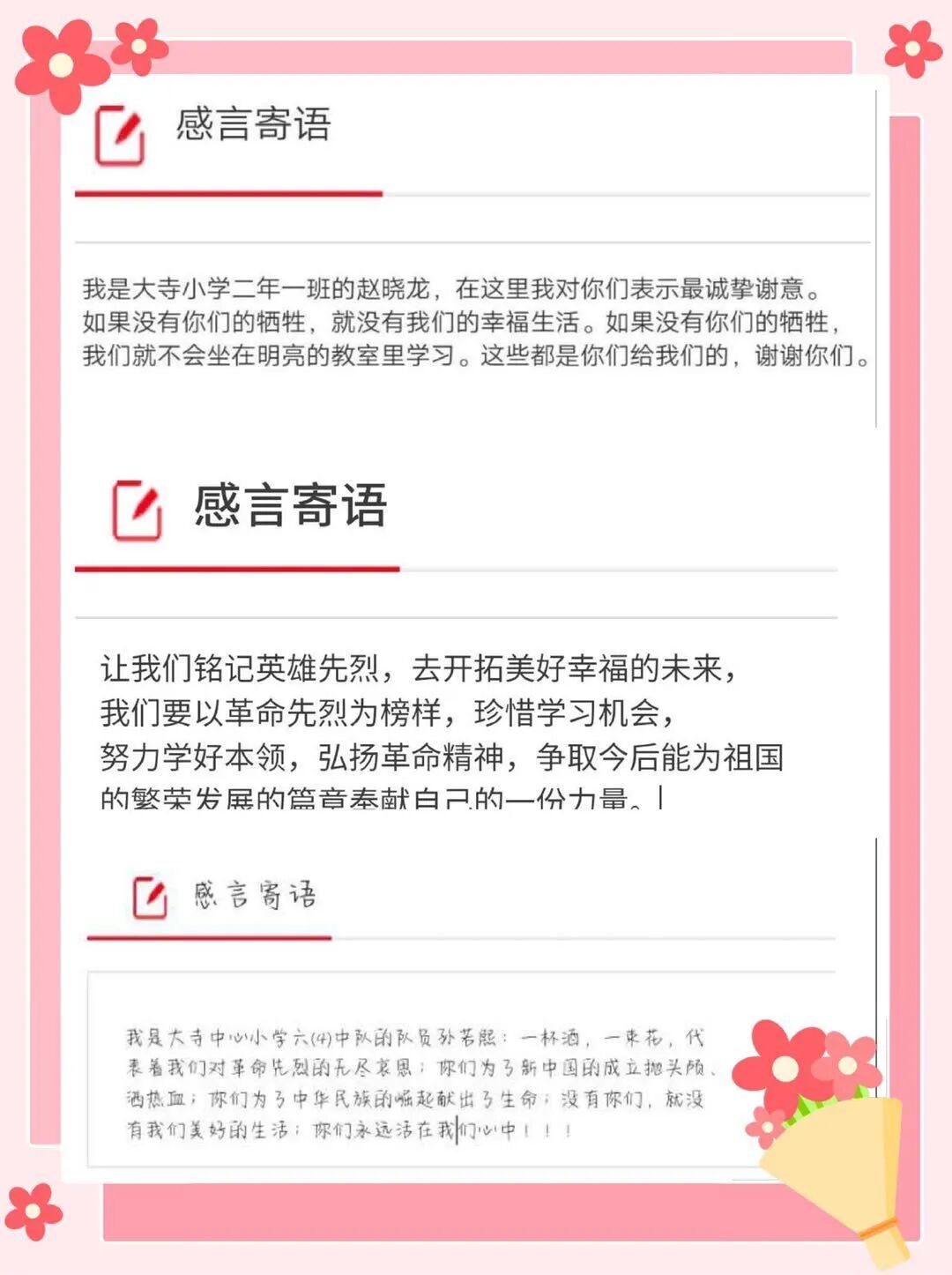 春回大地、绿满神州,又是一年清明时。为弘扬缅怀革命先烈丰功伟绩,引导全校少先队员铭记中华民族艰苦卓绝的奋斗历程,大力弘扬爱国主义精神,加强少先队员中华民族文化传统和中国革命传统教育,大寺中心小学少工委决定在清明节期间开展“童心同行战疫情 网上祭扫我先行”系列活动。
