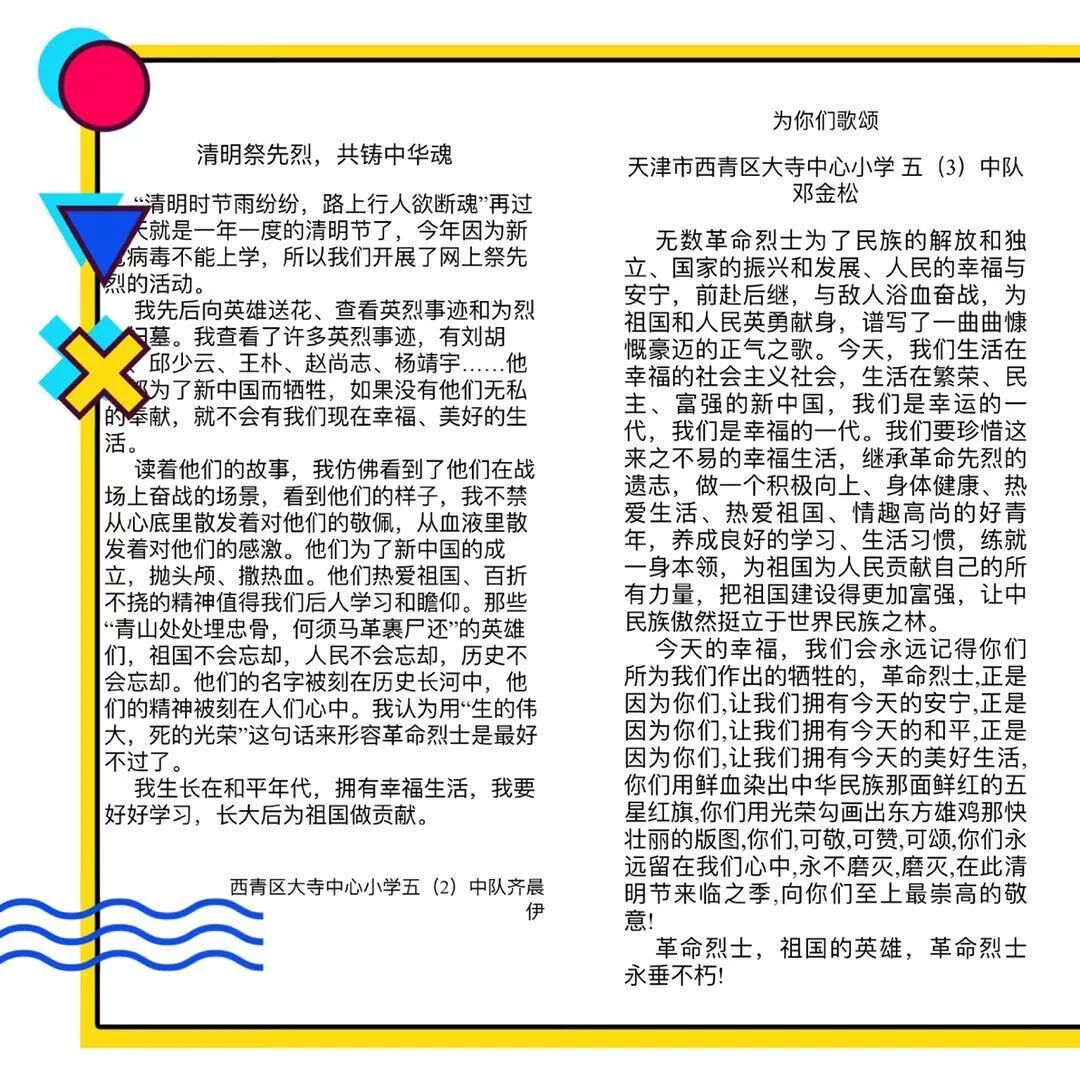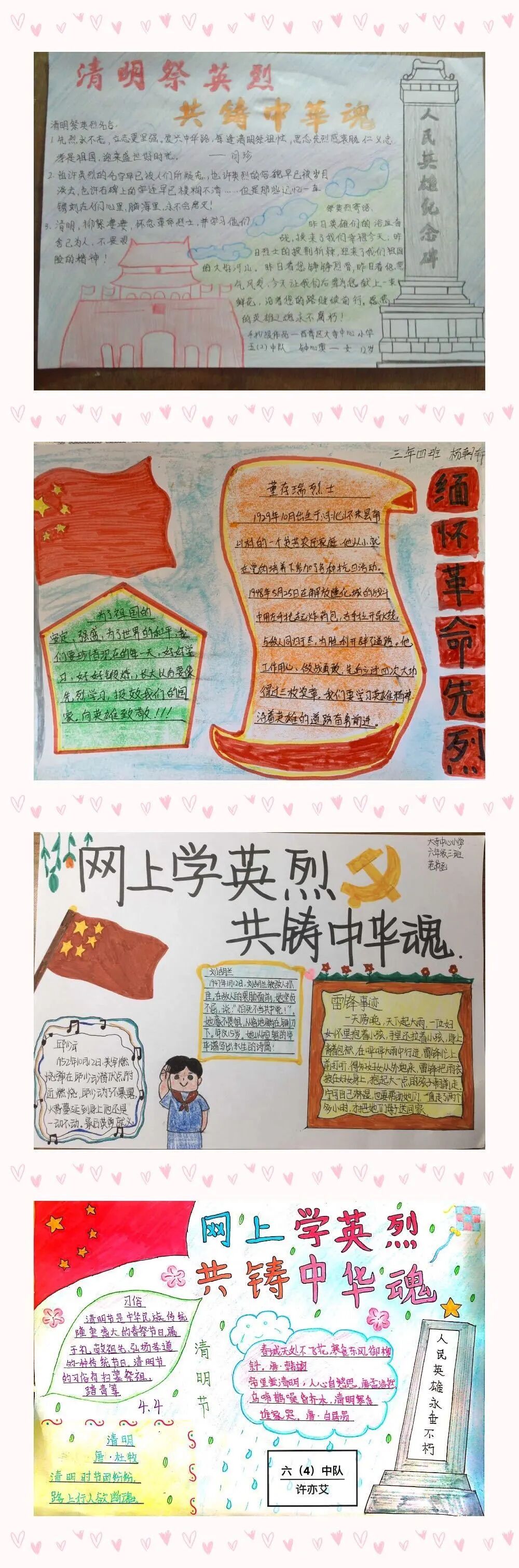 先烈的魂,民族的根。革命英烈,是一个民族永远的精神丰碑。历史不能忘,传统不能丢,精神不能缺。活动中,队员们通过网站平台向革命烈士献花、鞠躬、学习英烈事迹、进行签名寄语等活动,表达对革命先烈的崇高敬意和无限哀思。同时用自己手中的笔绘制手抄报、撰写活动征文缅怀革命先烈们,追寻他们的足迹,寄托着我们对先烈的哀思与敬仰,表达着我们的决心与信念。