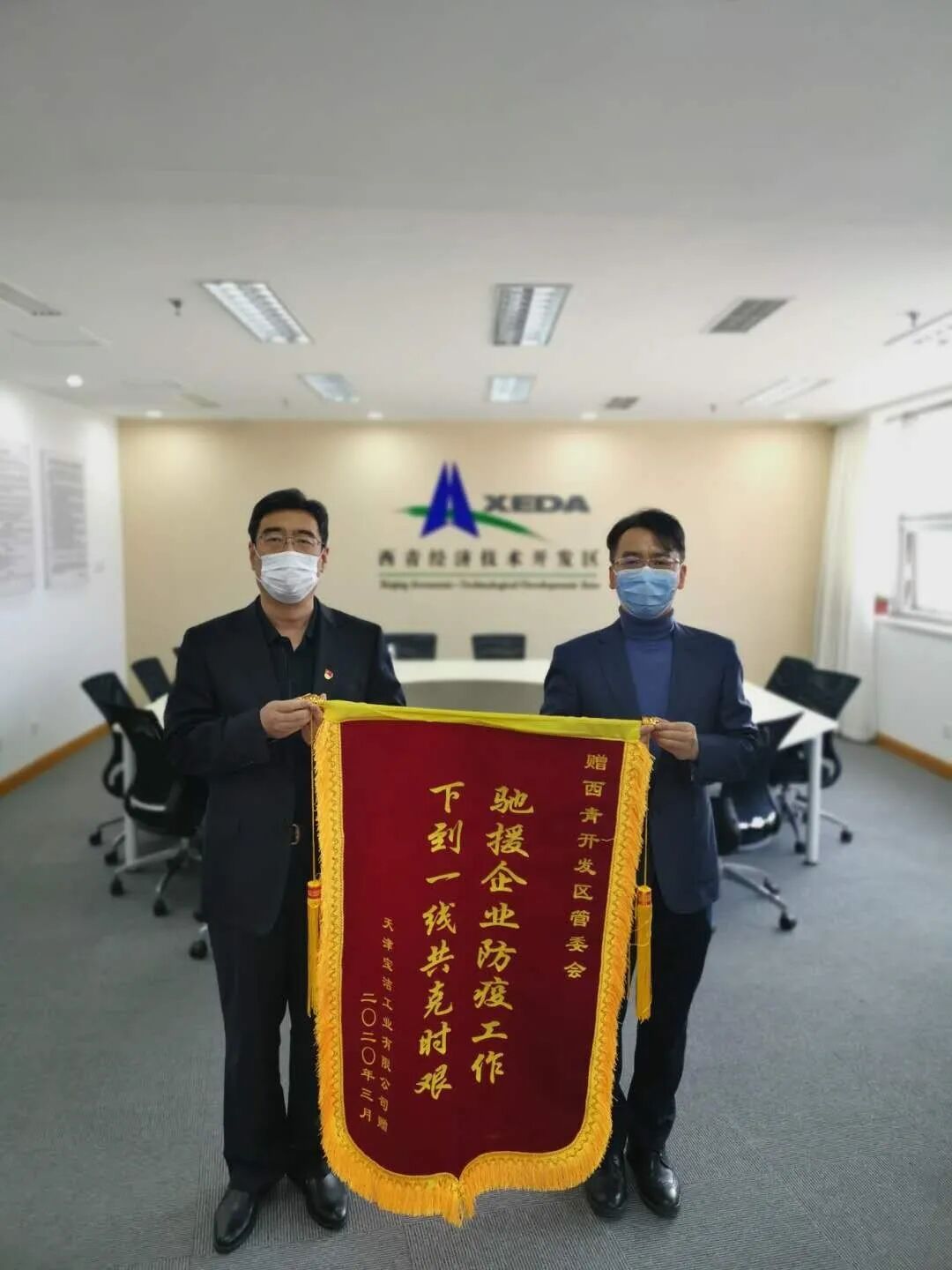 4月2日,天津宝洁工业有限公司总经理吴元奎一行来到西青开发区,送来一面印有“驰援企业防疫工作 下到一线共克时艰”的锦旗和一封感谢信,对疫情防控期间冲锋在前、坚守一线,为企业复工复产提供贴心帮助、热忱服务、有力支援的西青开发区领导和全体工作人员表示感谢。