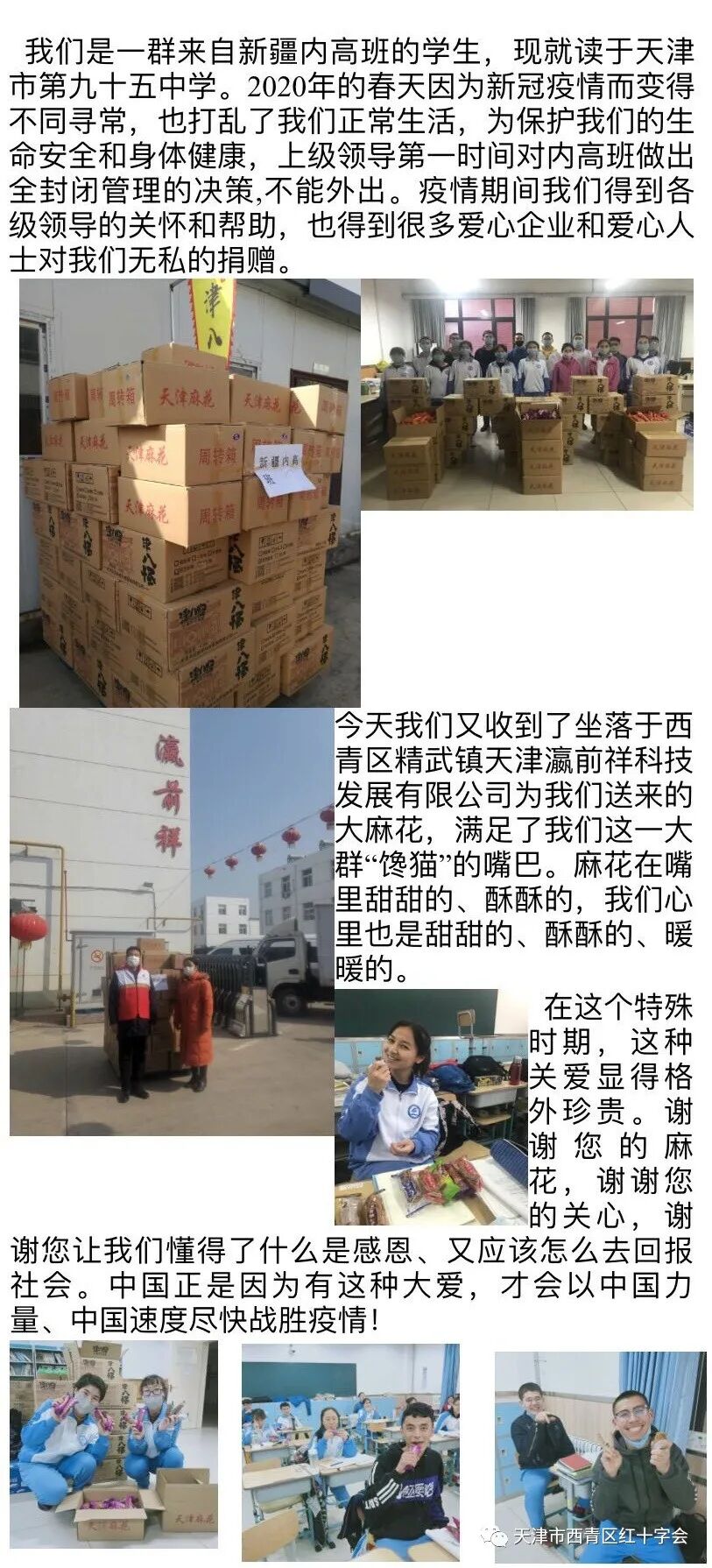 此外,天津瀛前祥科技发展有限公司也通过西青区红十字会为内高班学生捐赠了天津特产麻花,并表示“在疫情结束、新疆学子暑期归家之时,为每位学生再免费准备一份精品天津大麻花,将西青人民的热情和厚爱带回新疆”。